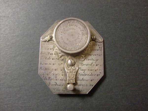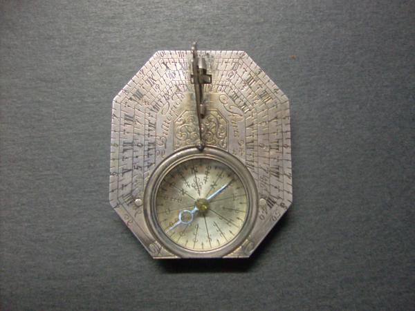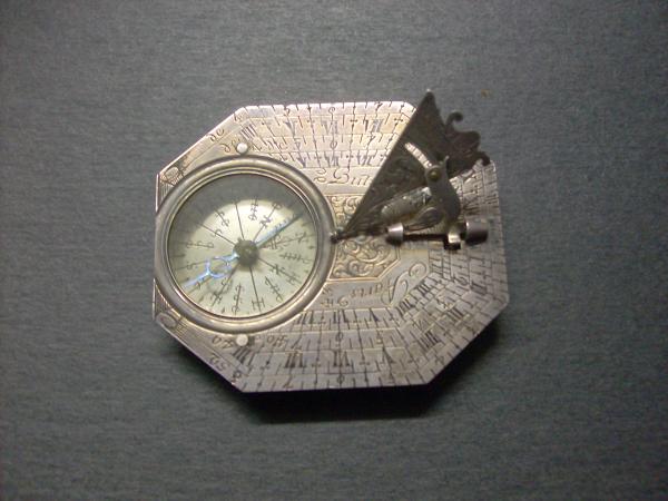 It's an late 17th century, early 18 century silver horizontal "Butterfield Sundial" Its a solid silver pocket sundial that was made in France by Michael Butterfield (1635-1724) & signed "Butterfield A Paris", with the "Fleur-de-Lis" hallmarks on both sides. This is a sophisticated sundial instrument consisting of an octagonal plate (measures 5.4cm, 2 1/8 inches) on which the shadow is cast through an adjustable quadrant, carried on a folding hinged gnomon & supported by a form of a small bird. The dial chapter includes four sets of engraved scales alternating in Roman & Arabic numeral made for latitudes. The dial incorporates a recessed compass with glass cover & latitudes of different European cities. The dial has its original leather covered traveling case with green velvet interior & silver lock. This Sundial is very similar to the Butterfield Sundial which belong to Louis XIV. Who passed it down to his great-great-great grandson Louis XVI who was be-headed in 1793 during the French Revolution. And the only thing Napoleon took was his Butterfield Sundial & Compass.