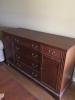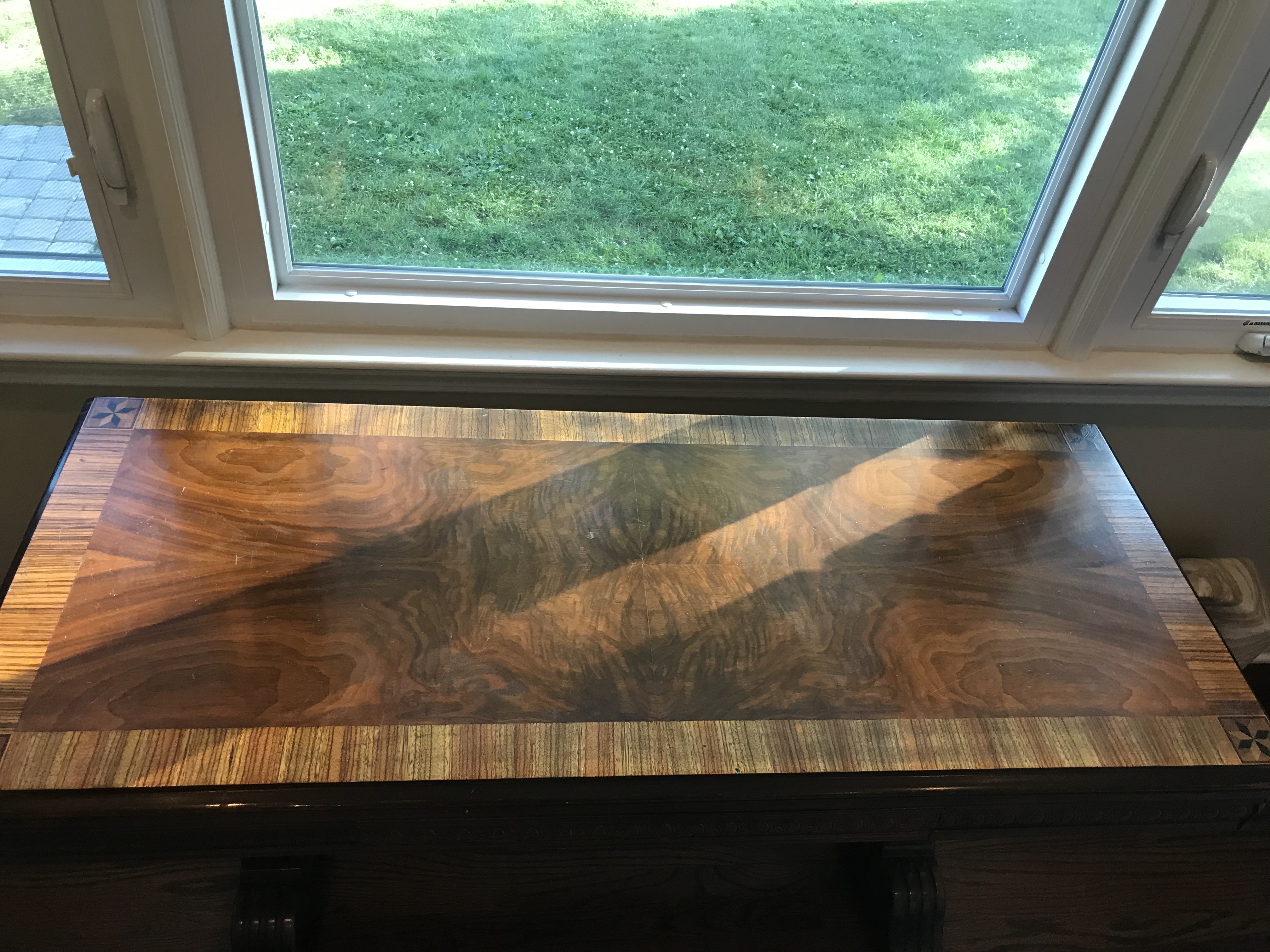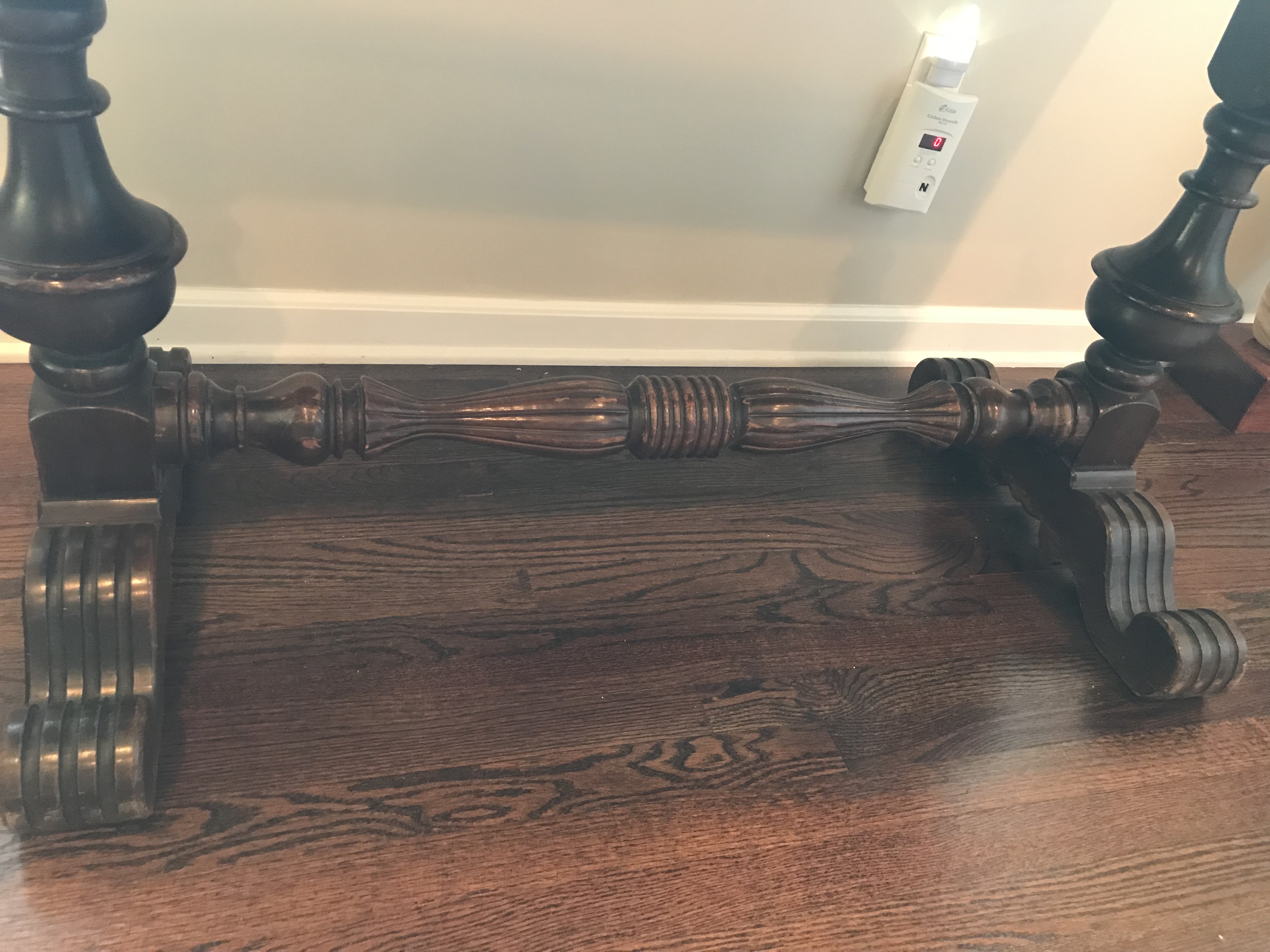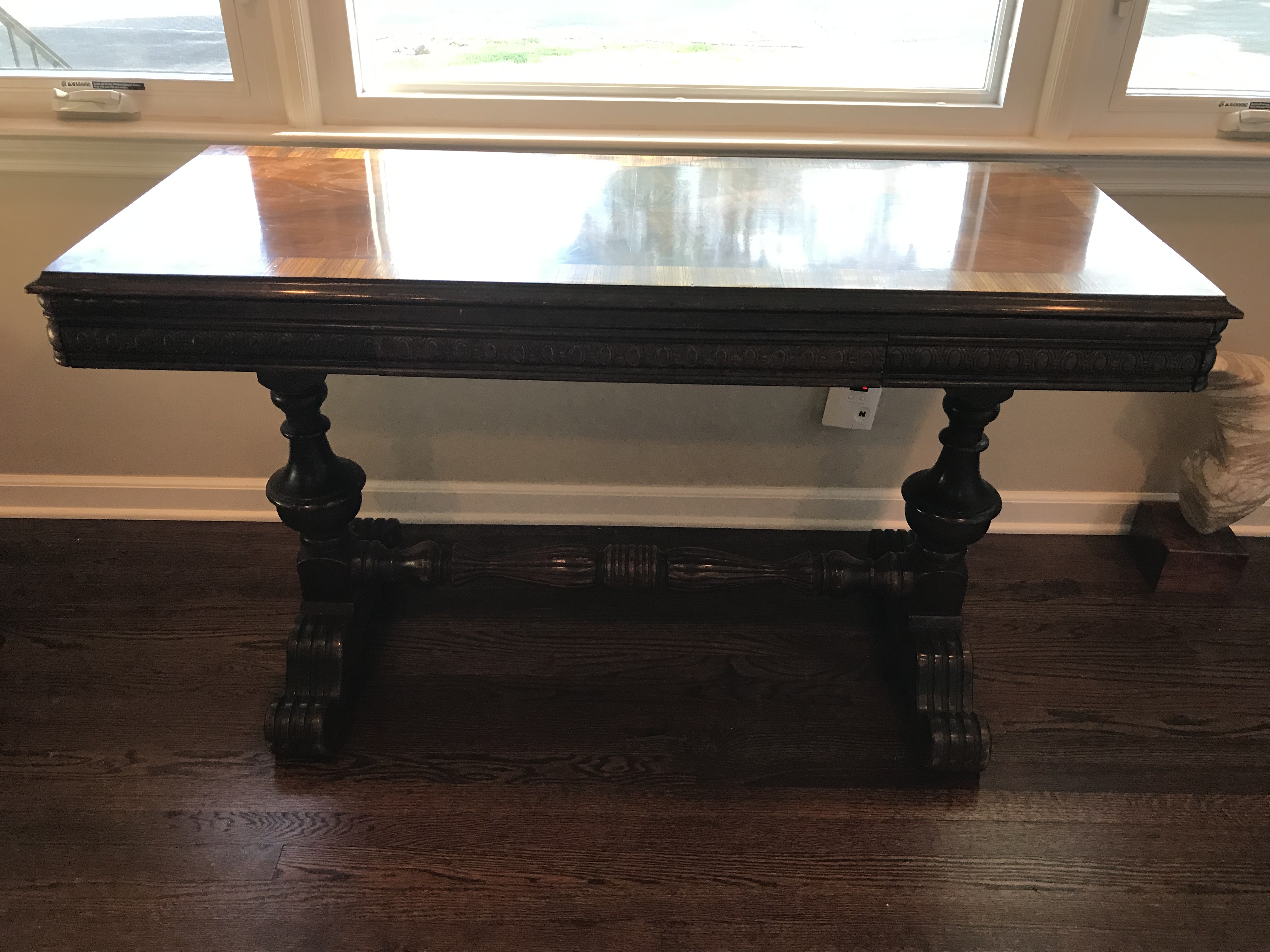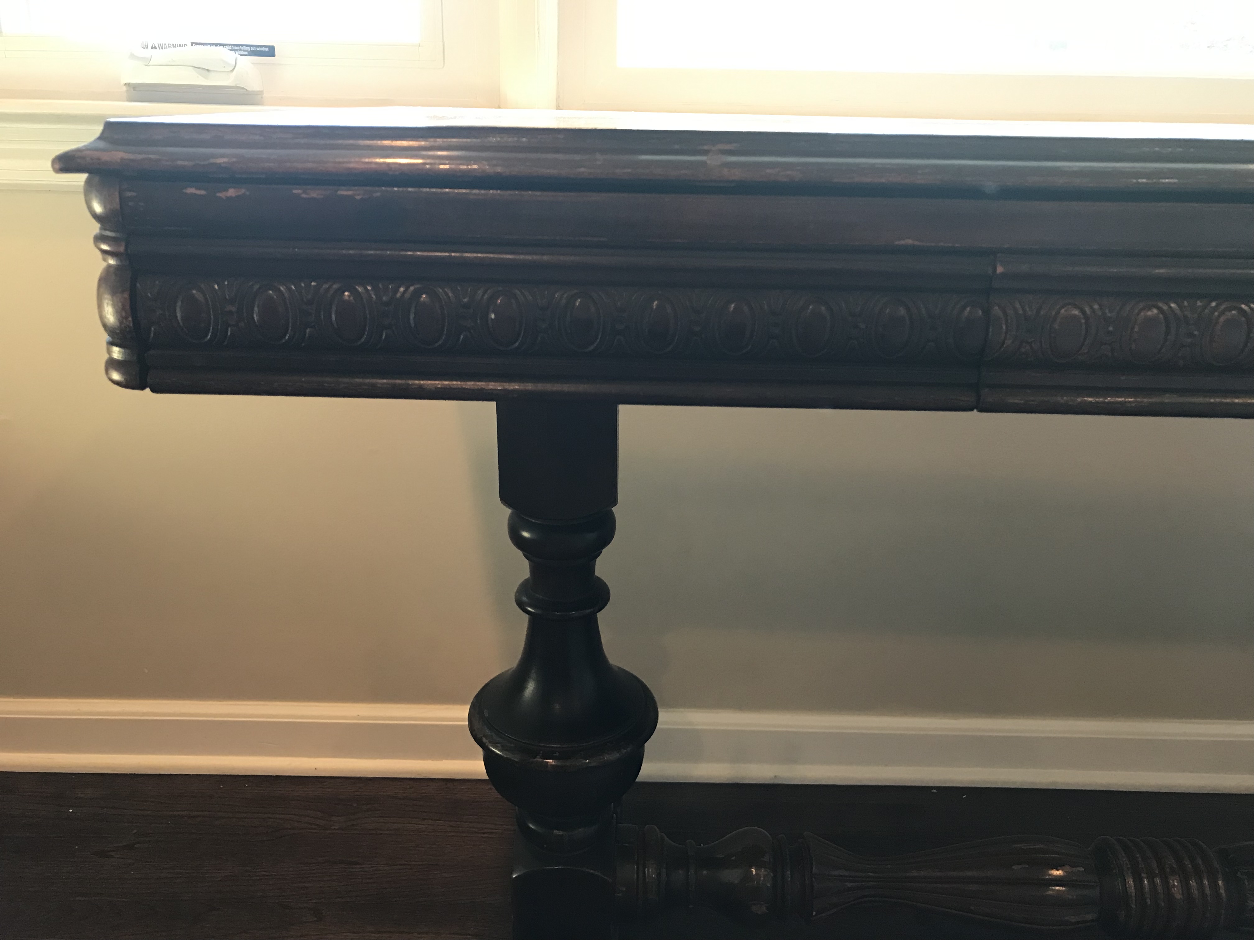 Library table (was a hand me down and don’t have any Information on it). Gorgeous detail on the top and carved in the wood. Both sides extend to double the depth. Small drawer in the front.