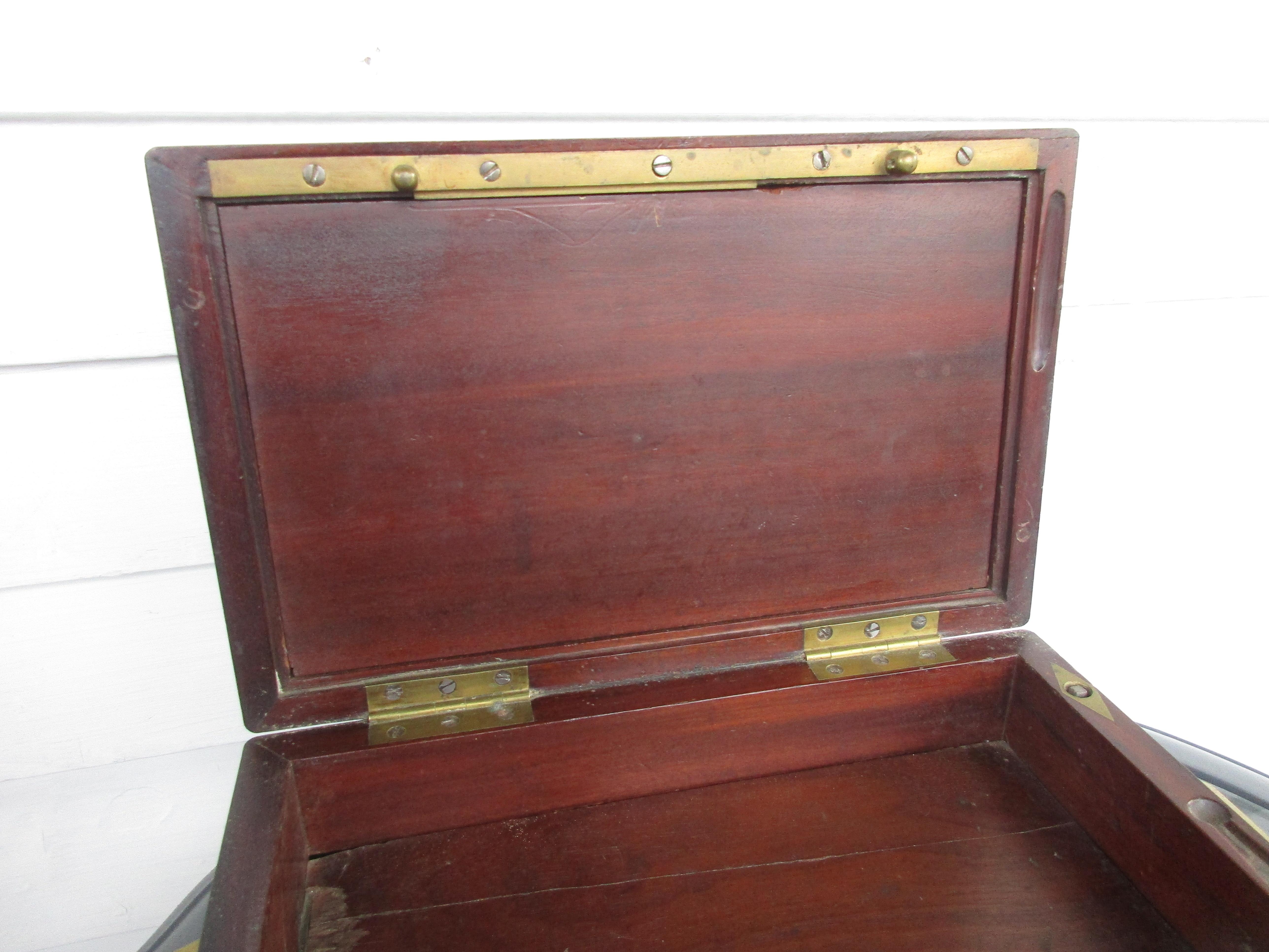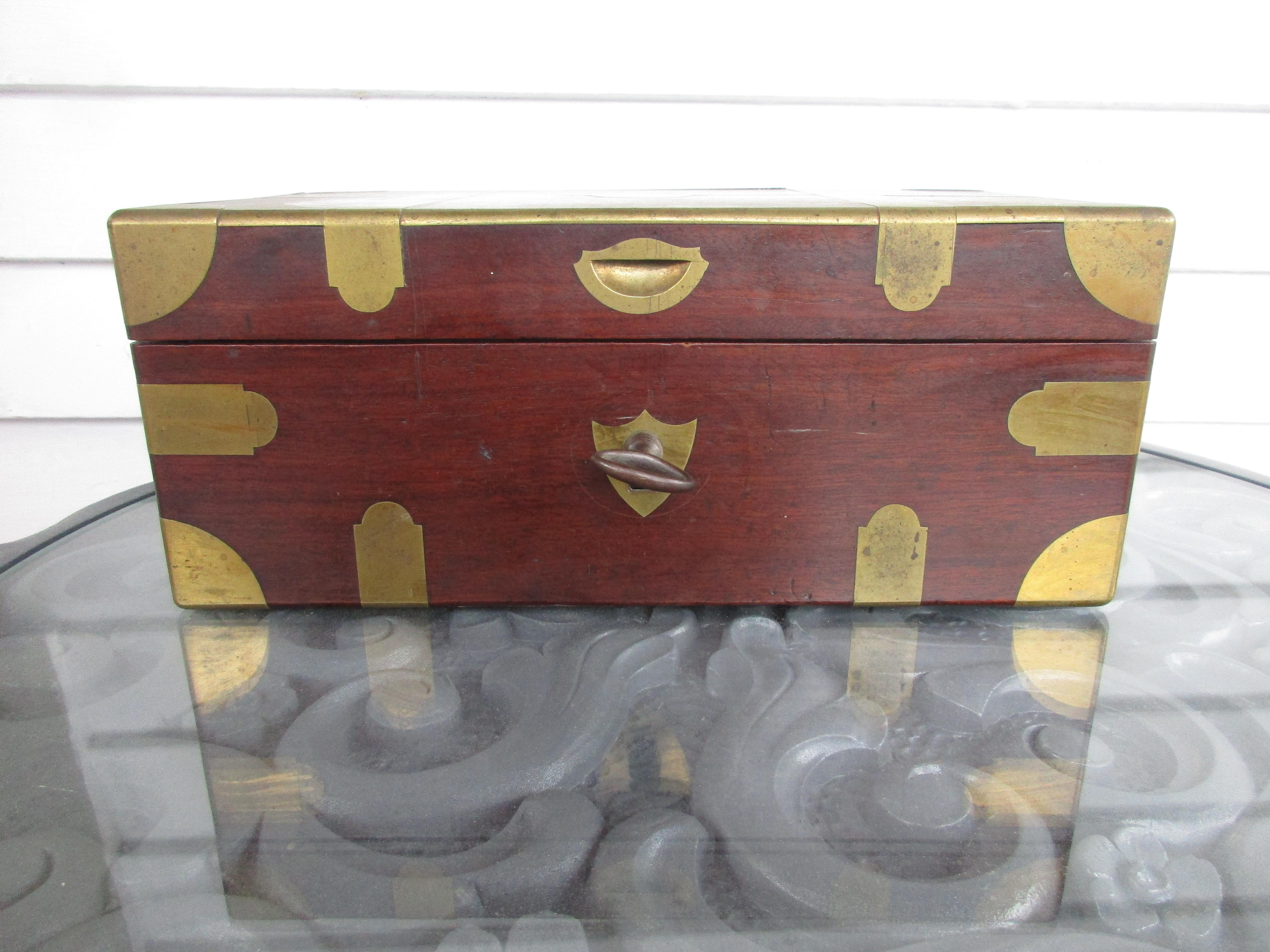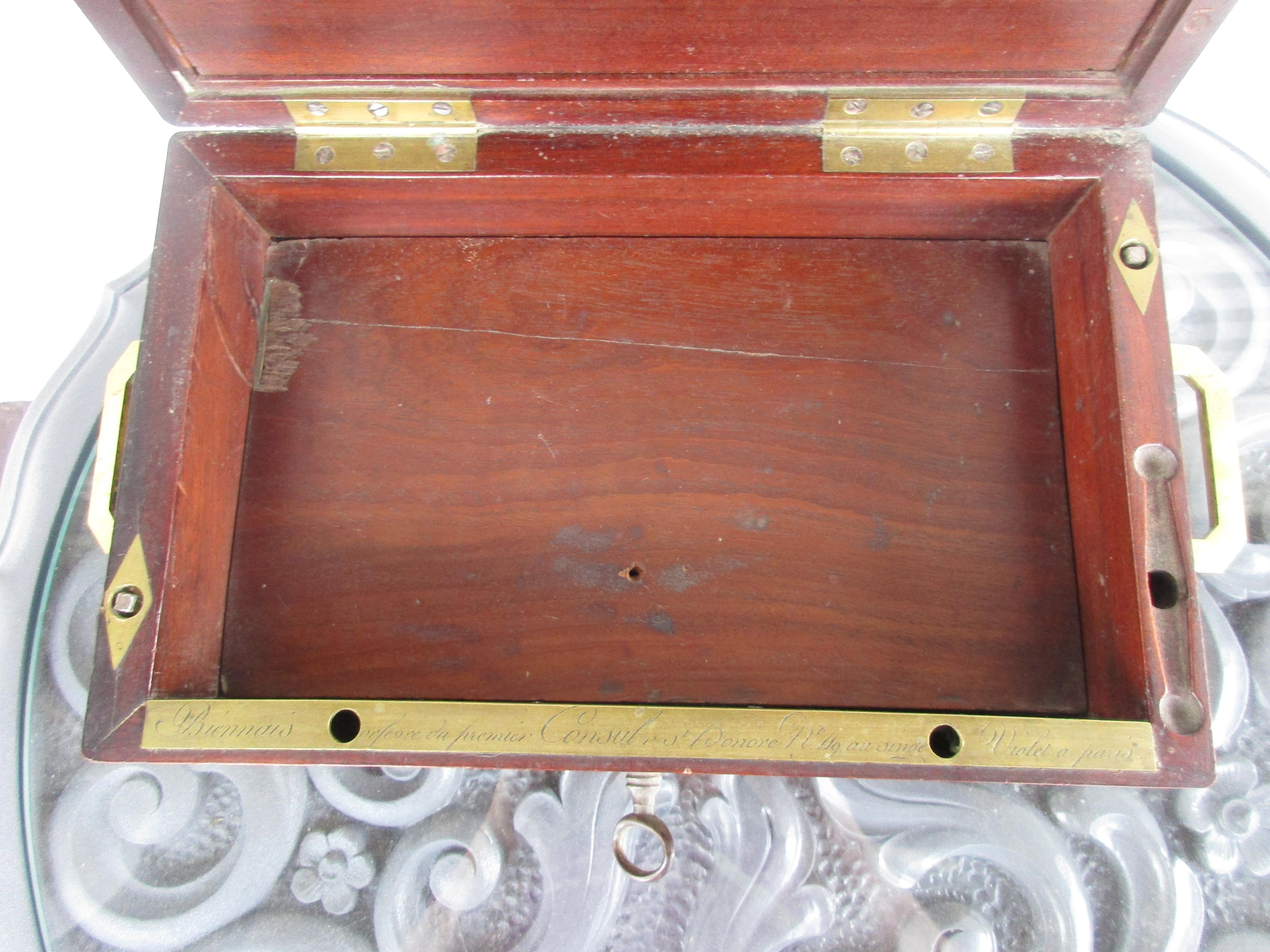 This is a beautiful box from Paris by renknown Goldsmith Martin-Guillaume Biennais (1764-1843). Inlaid brass with a shield insignia on top. There is a hidden bottom compartment that opens when you stick a pin down into one of the holes on the rim. There's also a compartment that opens inside the lid but the mechanism to reliease it (assuming it's the second hole on the rim) isn't working so it remainds closed. The lock works great!