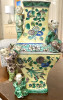 "Early 19th century 15 1/4. Pottery Temple vase. Rolled Scalloped Rim. Scrolled applied handles. Beautiful deep set color. Figure in garden scene. No marking. I paid 425 in 1982 but I don't know what the price is today."