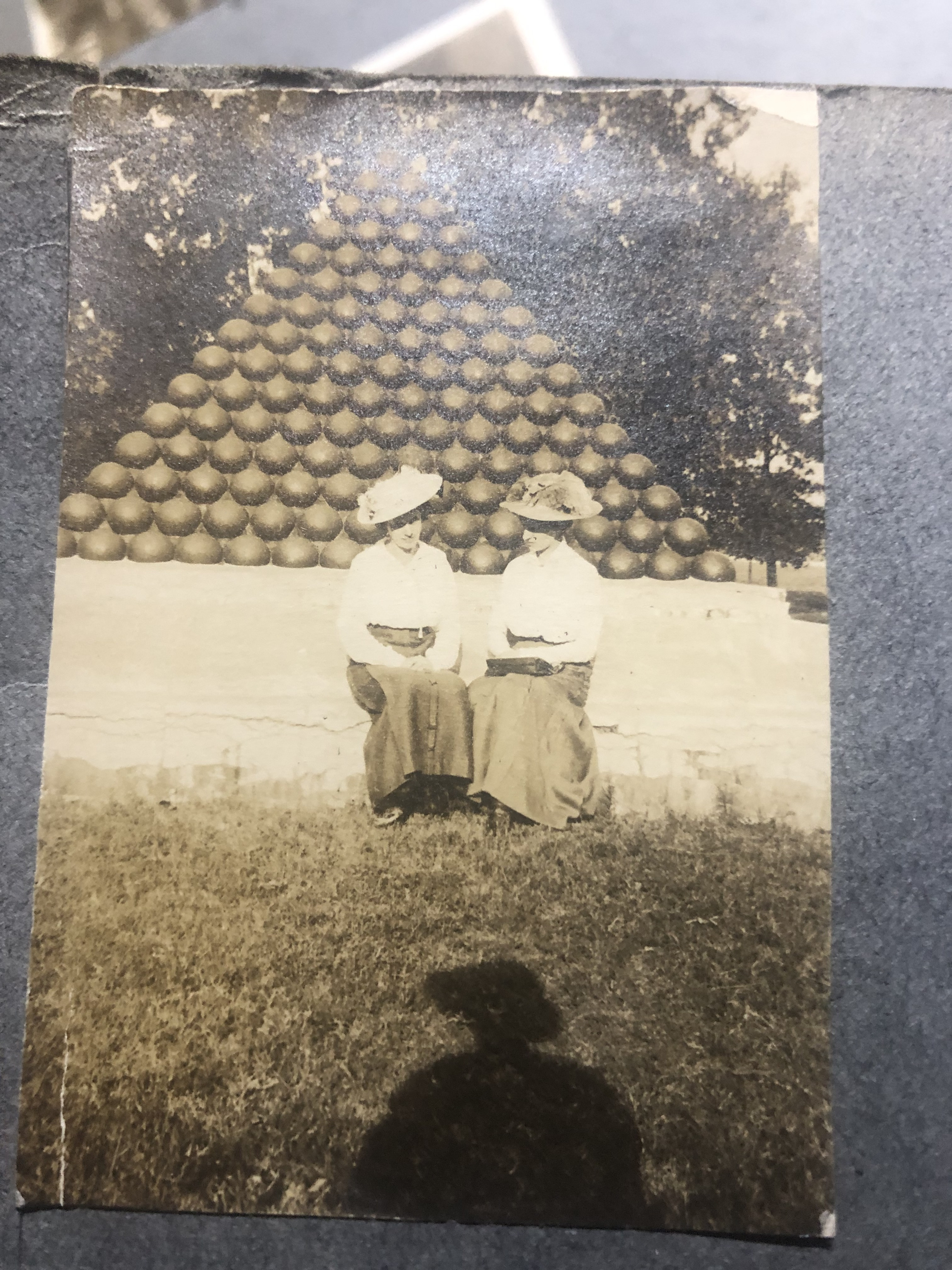 2. Two individuals standing in front of a large pyramid made of cannonballs.