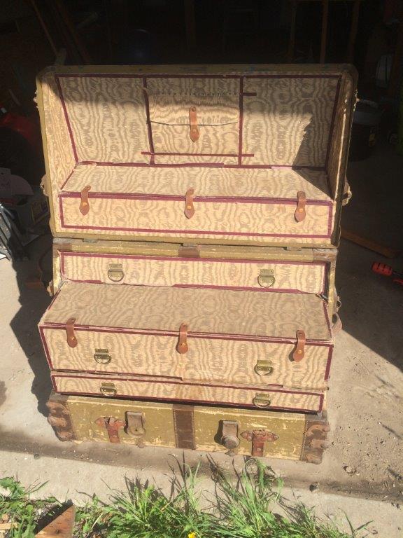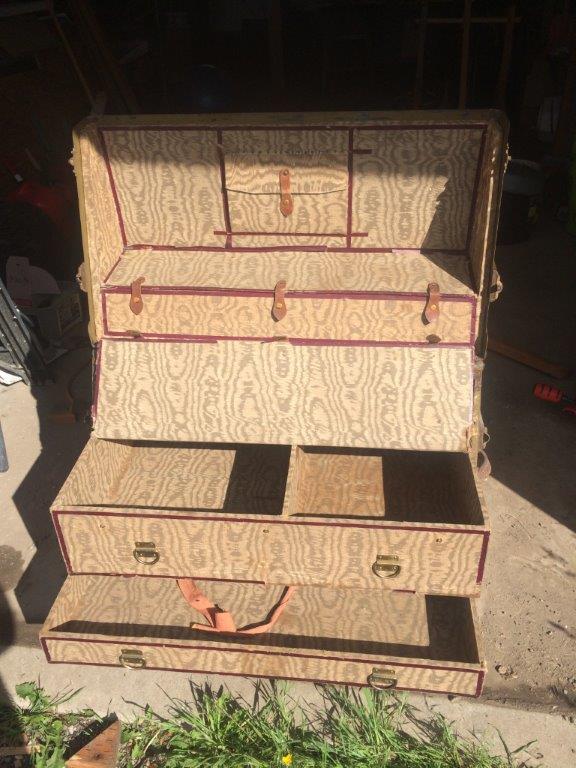 This is a wardrobe steamer trunk that I have been given. Think it has been in the family for quite some time, but not sure. There are no markings, inside or out except for a stensil paining on the bottom... 701 32 (see last picture). Closed, it measrues21.5 inches deep, 24 inches tall, and 33 inches wide. When open, it goes to 41" inches tall. All drawers are intact, all snaps snap. the outside is a bit beat up, locks appear to be broken. The very bottom drawer comes all the way out, as does the second from bottom. The second from bottom has a "lid" that allows you to open it up while pushed in, but only a bit, when you pull the drawer all the way out of the trunk, you have full access. There is also a 6-7" space all the way at the bottom of the trunk that would be accessable once the drawers are pulled out. There are 4 cast rollers on the bottom of the trunk, all are intact and still roll. I know nothing else about this trunk. I am hoping for some information as far as approximately what year it was made, who made it, and approximate value. Thank you for your help!