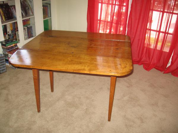 This table is a fold out table, golden colored wood, very old. It was made before they used nails in building, you can see some of the pegs though others at later times added metal rasps with screws. It was handed down in my family, my mother was told it is Early American Colonial. There were three pieces, though they were not a set together. They are all really old. This table is well shined, has some burn marks on top but overall wood looks nice.