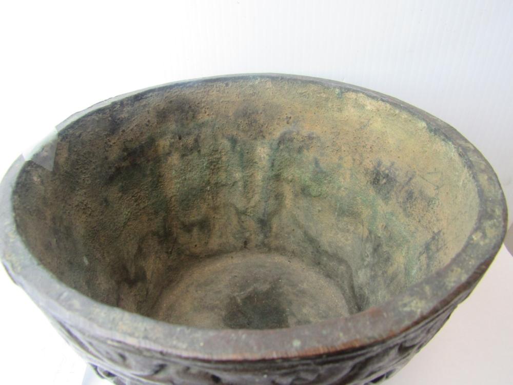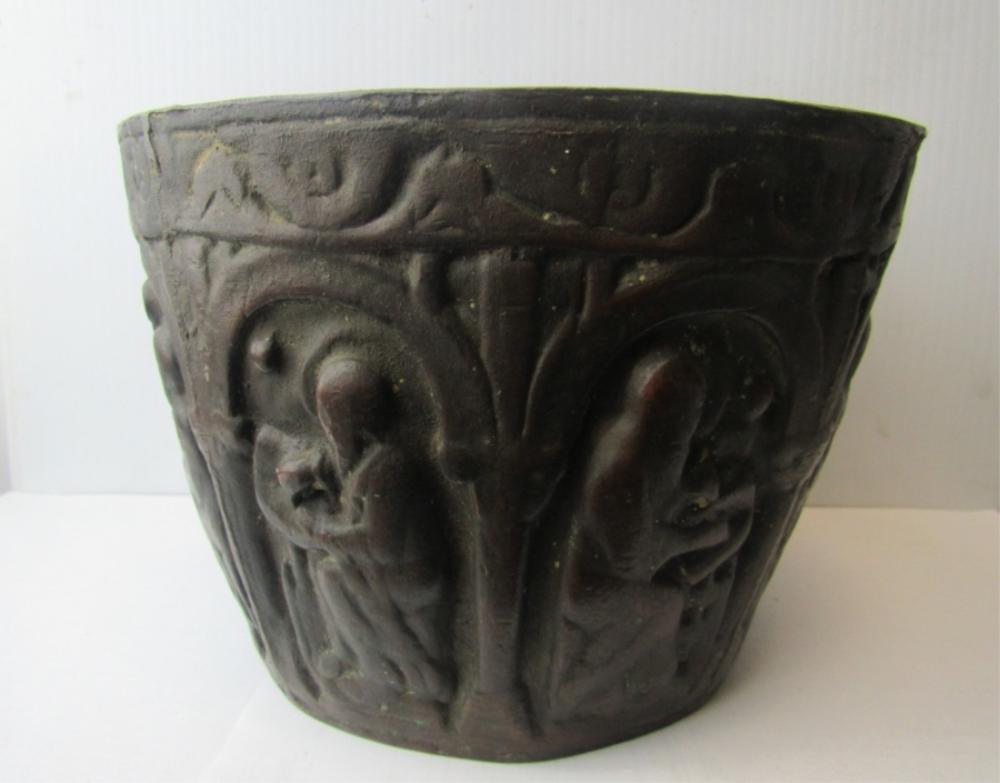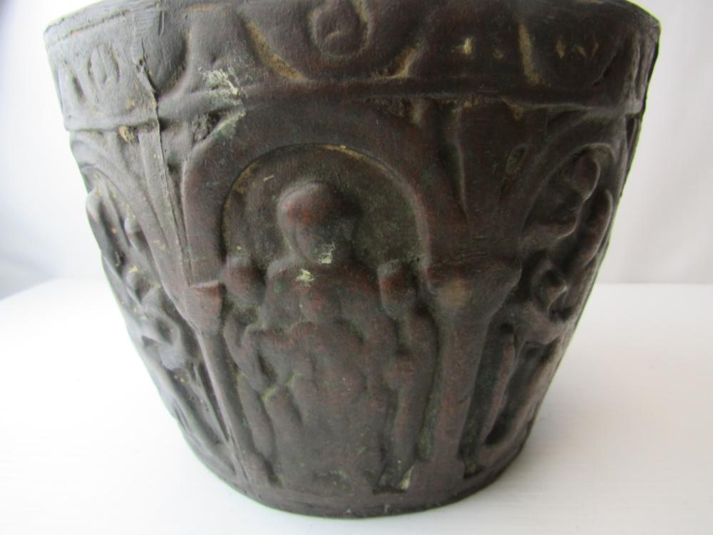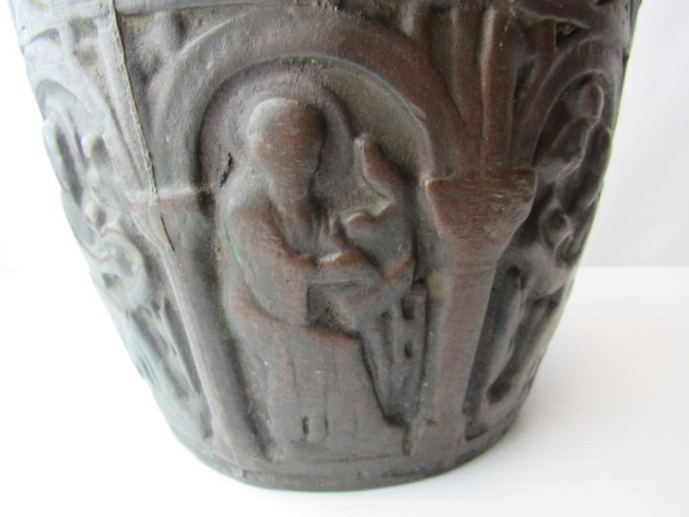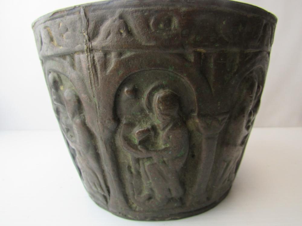 This appears to be an early medieval cast bronze mortar but I would like additional opinions. Its dimensions are correct--about 6" high, and about 8.75" at the rim, flaring out from a smaller base. Around the sides are six images that appear to be the four evangelists, Moses with tablets, and the Madonna with child. All are seated beneath early Romanesque arches. The Madonna is enthroned facing forward with the Christ child in her lap also facing forward with two figures on either side, a version that is much more common from the 11th century and earlier. There is significant wear, a smoothing of the images with loss of detail and the patina seems correct. Stress fracture lines on the base and wear at the bottom of the mortar suggest many years of pounding with a heavy (probably bronze or iron) pestle. The lack of handles or rings also appears consistent with the very earliest mortars and the casting lines on the side are also found in very early medieval bowls. This appears to be authentic and I am guessing that it was used in a religious hospital, but I would like the opinion of others with greater knowledge of early medieval objects.
