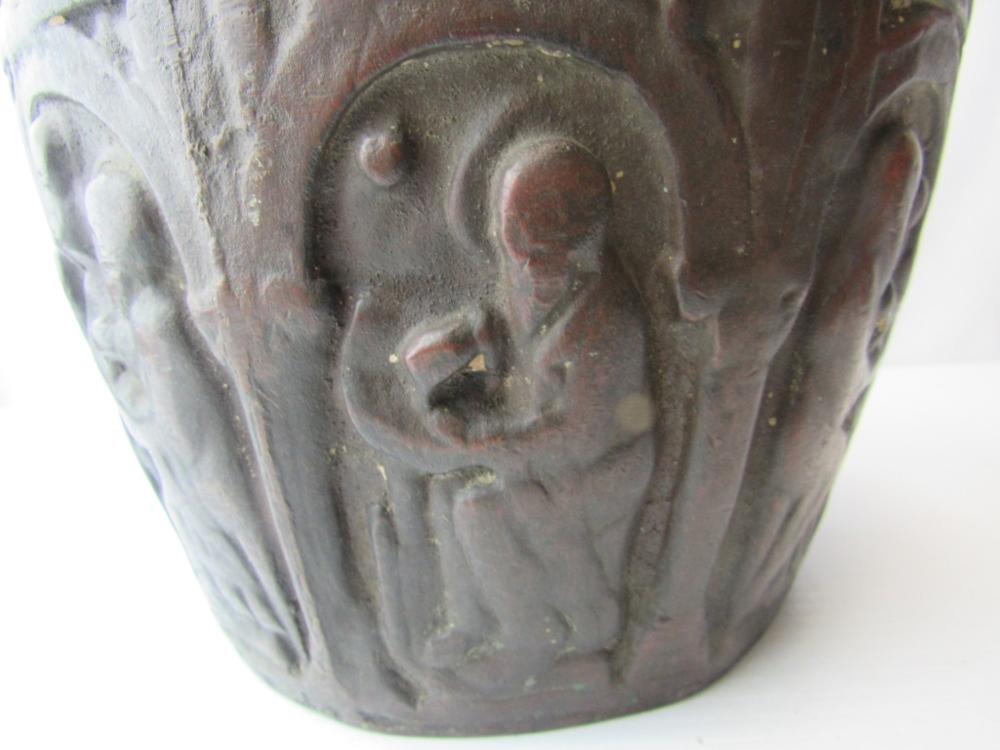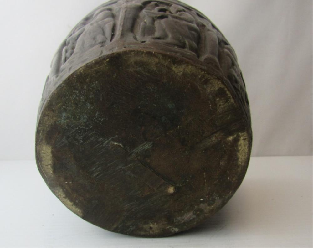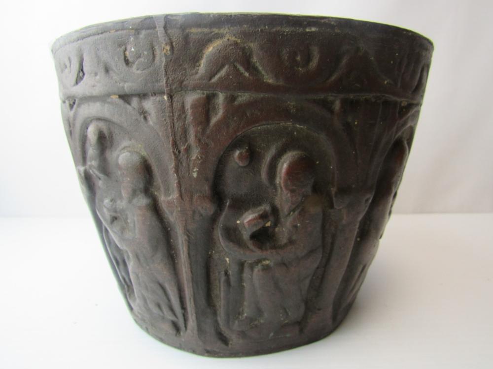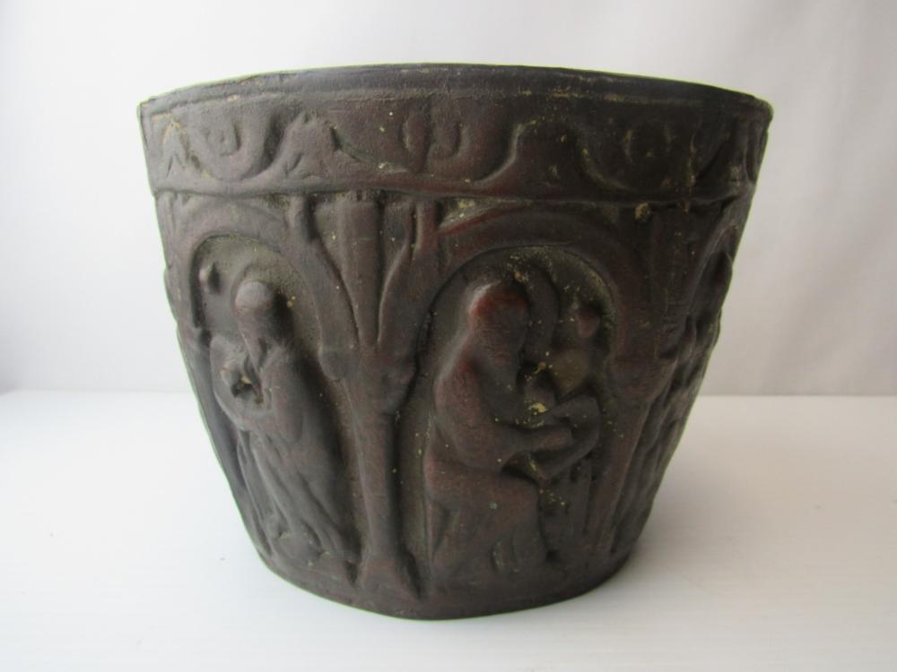 This appears to be an early medieval cast bronze mortar but I would like additional opinions. Its dimensions are correct--about 6" high, and about 8.75" at the rim, flaring out from a smaller base. Around the sides are six images that appear to be the four evangelists, Moses with tablets, and the Madonna with child. All are seated beneath early Romanesque arches. The Madonna is enthroned facing forward with the Christ child in her lap also facing forward with two figures on either side, a version that is much more common from the 11th century and earlier. There is significant wear, a smoothing of the images with loss of detail and the patina seems correct. Stress fracture lines on the base and wear at the bottom of the mortar suggest many years of pounding with a heavy (probably bronze or iron) pestle. The lack of handles or rings also appears consistent with the very earliest mortars and the casting lines on the side are also found in very early medieval bowls. This appears to be authentic and I am guessing that it was used in a religious hospital, but I would like the opinion of others with greater knowledge of early medieval objects.