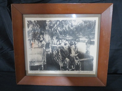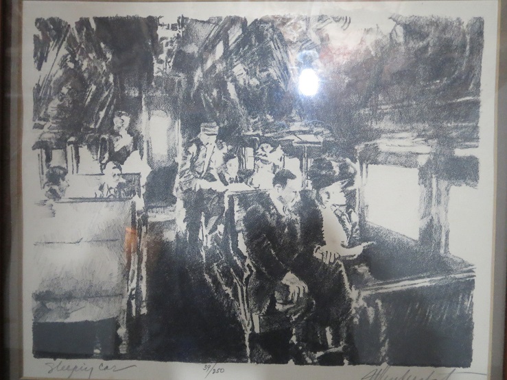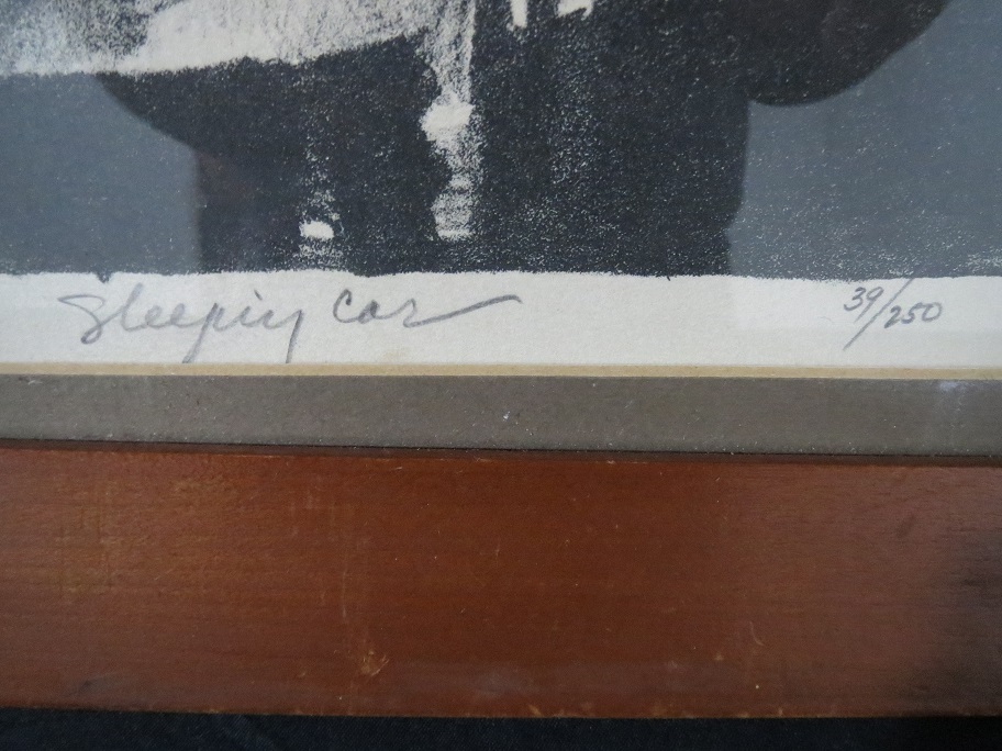 This is charcoal art work of a railroad car with people inside. It appears to be early, but I am so new at this. The work is titled "Sleepiy Car" with the "iy" and signed in pencil and appears to say J Hendershot. I truely can not tell. Also in pencil is 39/250.