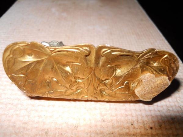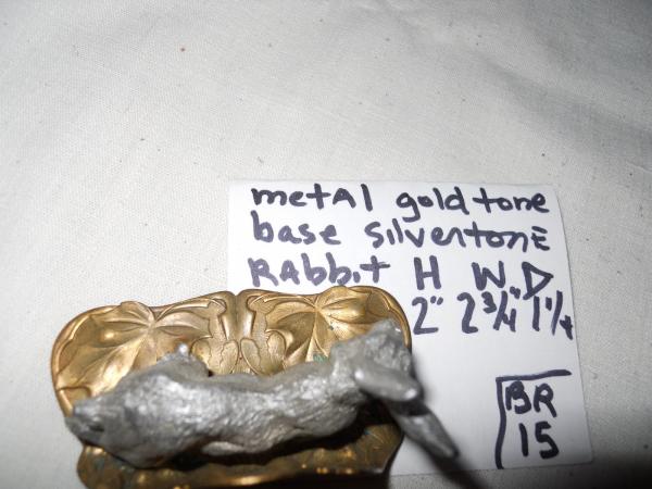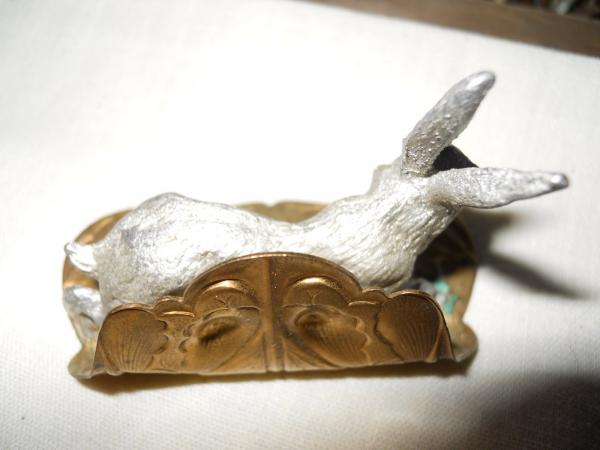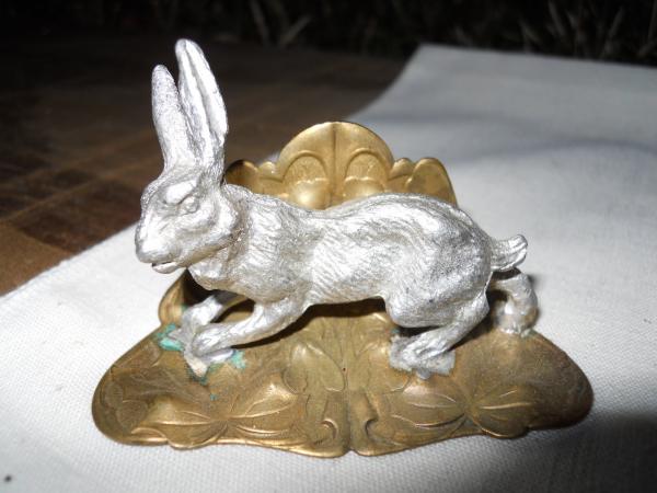 Looks like those old napkin ring holders. Silvertone hare on goldtone backdrop