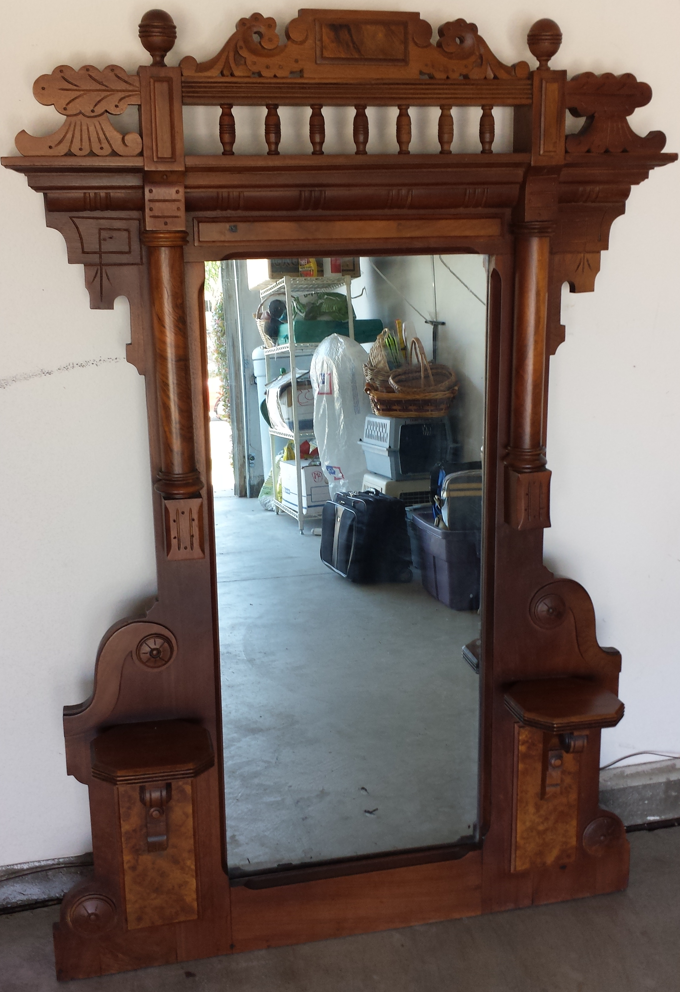 Thank you Lovejoy for your question.There is nothing broken on/from the mirror. The photo I took is dark, and the mirror is next to a covered upholstered chair, which apparently is hiding the bottom left corner of the mirror that you may be concerned about. I cannot lift the mirror (it's very heavy!) to give a better photograph until I have someone here to help me lift it in a week or two. I can take other photos at that time.