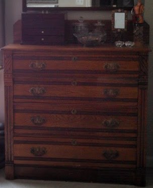 Eastlake Victorian Dresser with backboard and 4 drawers, scalloped and pegged. Wood is walnut I think.