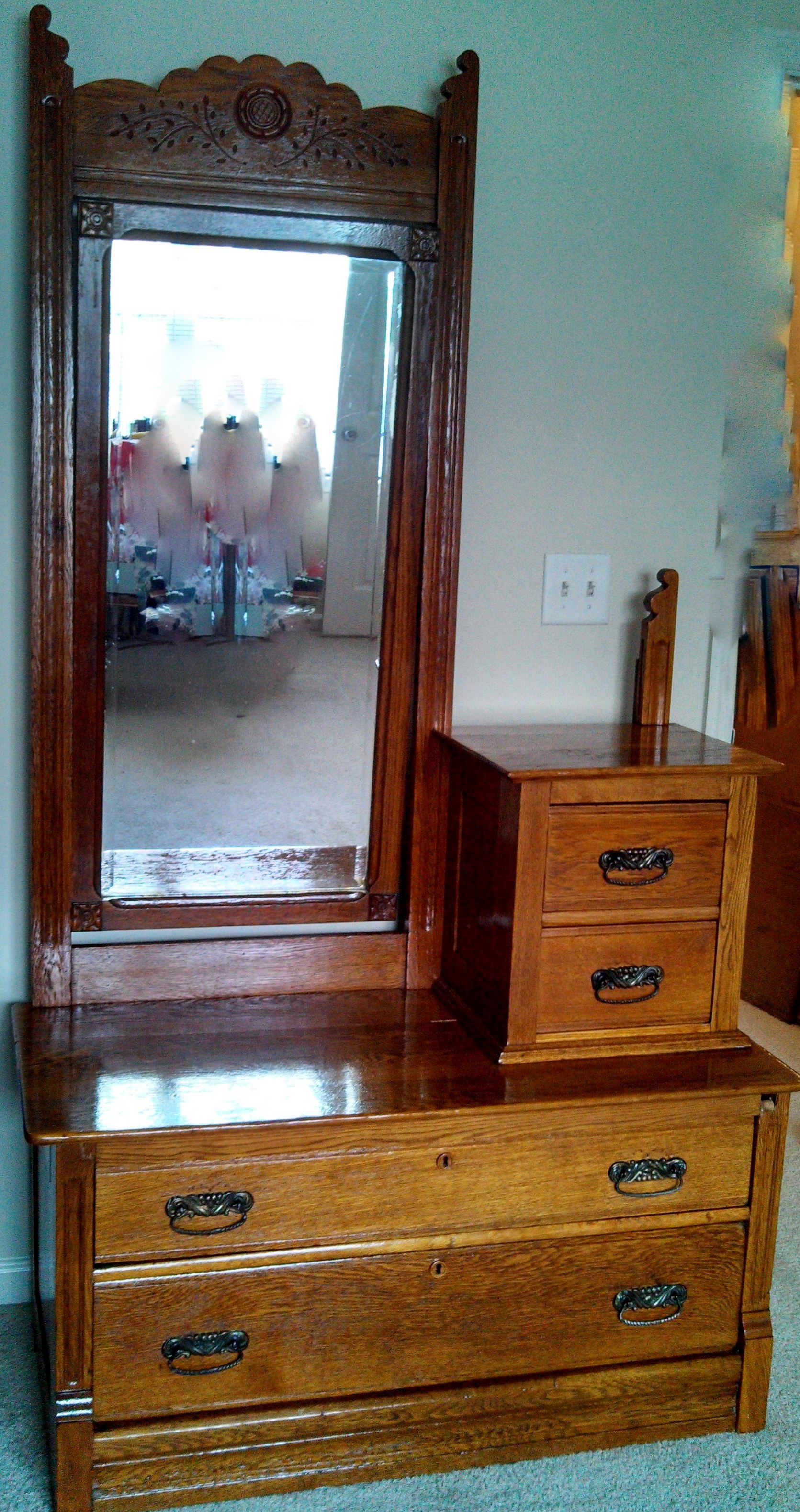 Eastlake Victorian Dresser, 2 long drawers, 2 short drawers on top of one side, tall swivel mirror on other side. Drawers are scallop and peg.