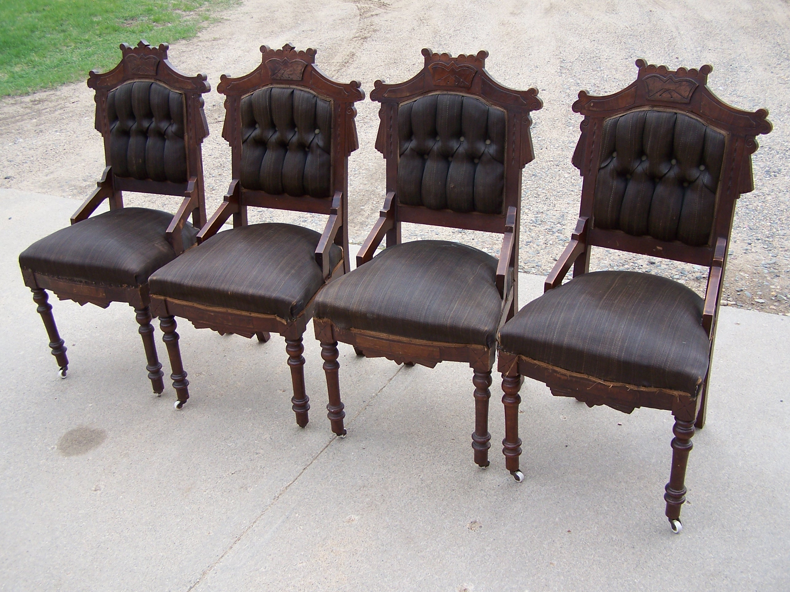 Hello and thank you for your post. Your chairs are actually from the 1890 - 1910 production period at Eastlake. The lot of four chairs, if sold together, would bring about $475. A single chair would bring between $75 - $95 on the high end retail, but would sell quickly, wholesale, in the $55 range (maybe a tad less).