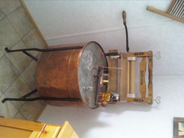 This is a old ringer washer, with crank for tub itself and crank for the ringer on top which is mad of wood, the tub for washing is made of brass and the legs are metal.