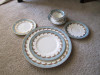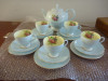6 cup and saucers,and I believe they are dessert plates (6). I am not sure what exactly to call it but a creamer or gravy dish a sauce/dipping dish or sugar bowl and a medium plater like a cracker plate.