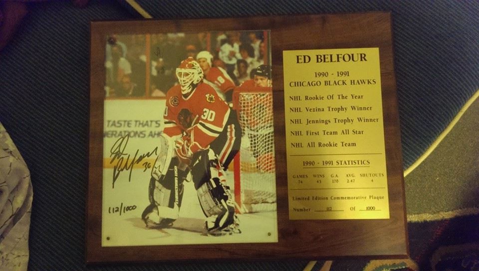 Ed Belfour Plaque I received 17 years ago. I was told by the people that gave it to me that their uncle had coached him during highschool or college and that half of these were destroyed in a fire. Stats are engraved onto the plate. And the picture is under plexiglass. Condition is quite good but not mint. some scratching on the plate with the stats. Have been looking for years and have not been able to find ANY information about this. I know it's not a gold mine, but I am just curious as to where it was made, and value etc.