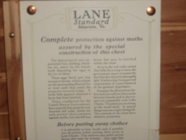 Ed Roos Company of Forest Park Cedar Chest, Forest Park Line, I have the certificate that says The Cedar in this chest is guaranteed to be genuine tennessee Aromatic Red Cedar. On the bottom of the chest it says No 3400, then the number 4527 and walnut are stamped on it.