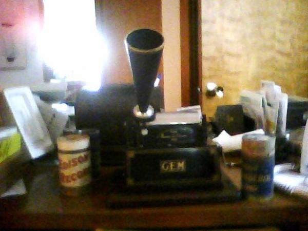 Classic wood cabinet with carrying case. Crank model in working condition. Thirteen original vinyl cylinder recordings. Megaphone attachment