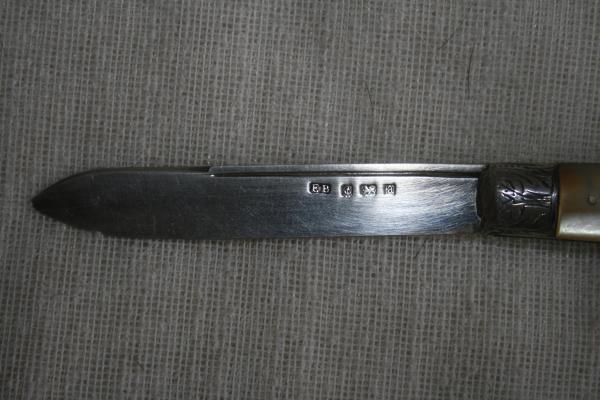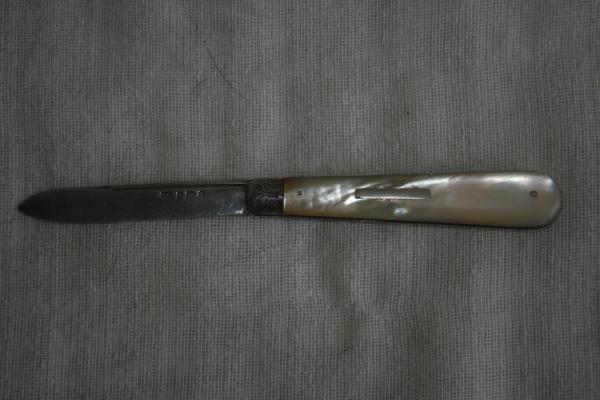 Engraved sterling silver and mother-of pearl fruit knife from the Edwardian period. Blade has 4 marking - one of which appears to be the initials of the craftsman (EB). The other 3 are perhaps a lion, an anchor and the letter "a"(naked eye).