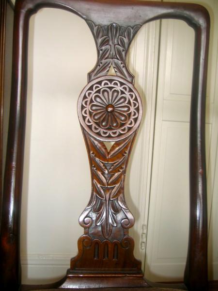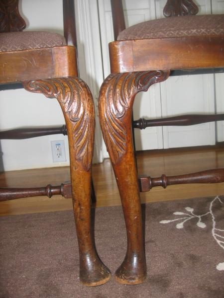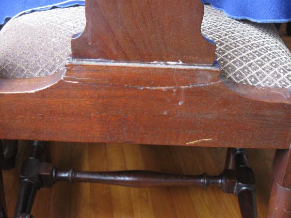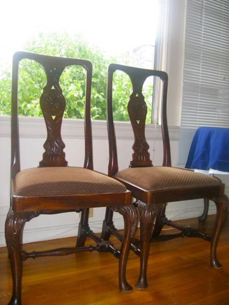 Two Edwards & Roberts dining chairs, without arms. They have some nicks and scratches consistent with regular use. The back of one of them was broken and glued somewhat sloppily.