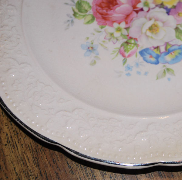 This is a antique china plate made by The Edwin M Knowles China Company in about July of 1932 according to the date stamp. It's the Roselace pattern in pink china with Platinum trim, and a flower design in the center with a raised flower design around the edges.