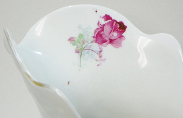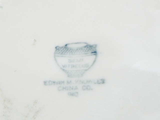 Pitcher lg size gold edge 12 inches tall has a rose on the inside lip excellent condition Is marked on the bottom Roses on outside pink in color Bottom says Semi vitrecus Edwin M Knowles china company lokks like 910 not sure what it says
