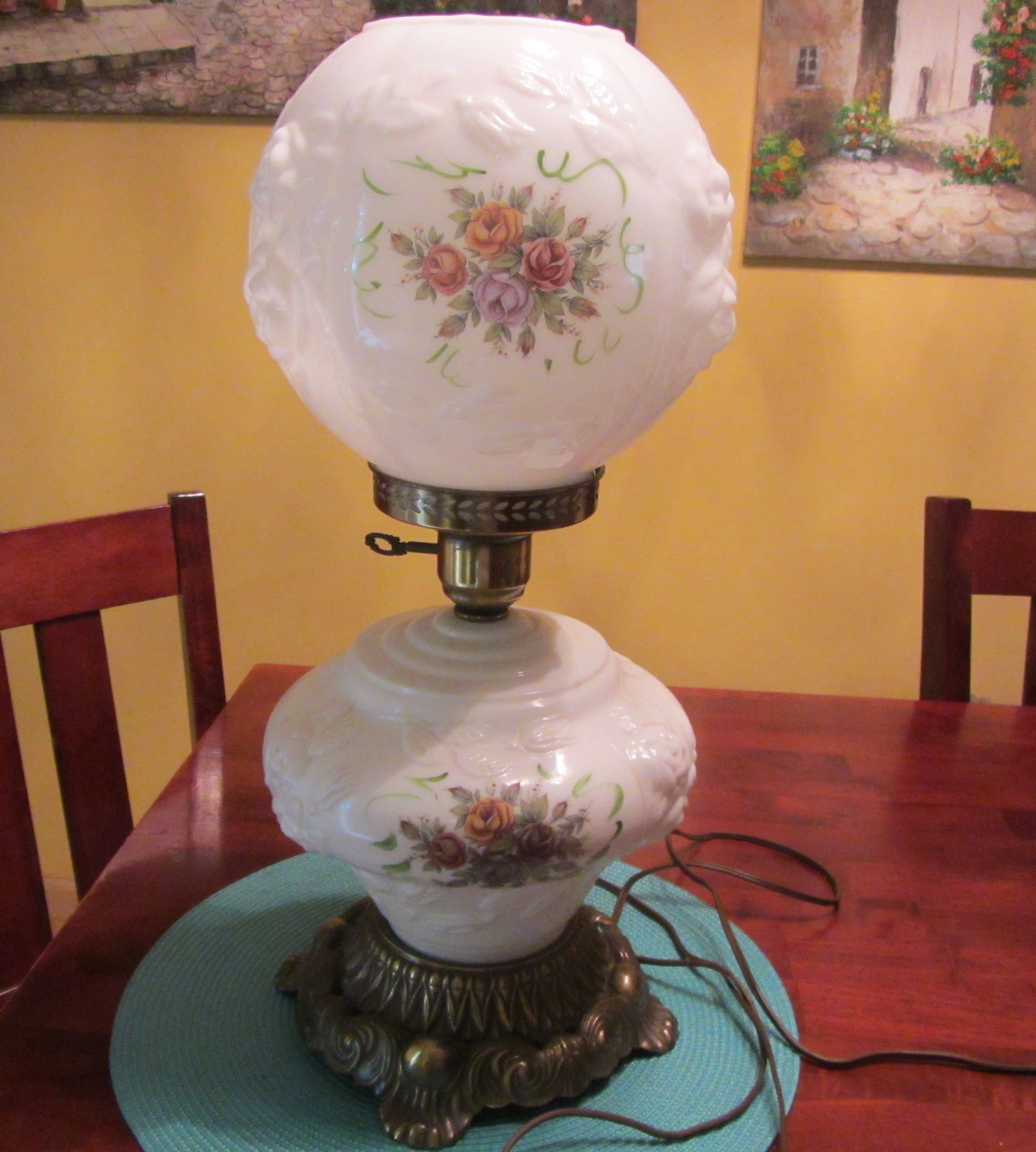 Excellent condition, no scratches or cracks. Works. Upper and lower white glass bulbs with handpainted floral design, each globe lights separately or both together. Metal base. 20.5 inches tall. Markings on metal base - EF and EF Industries #527X. This was my Grandmothers. Would like to know value.