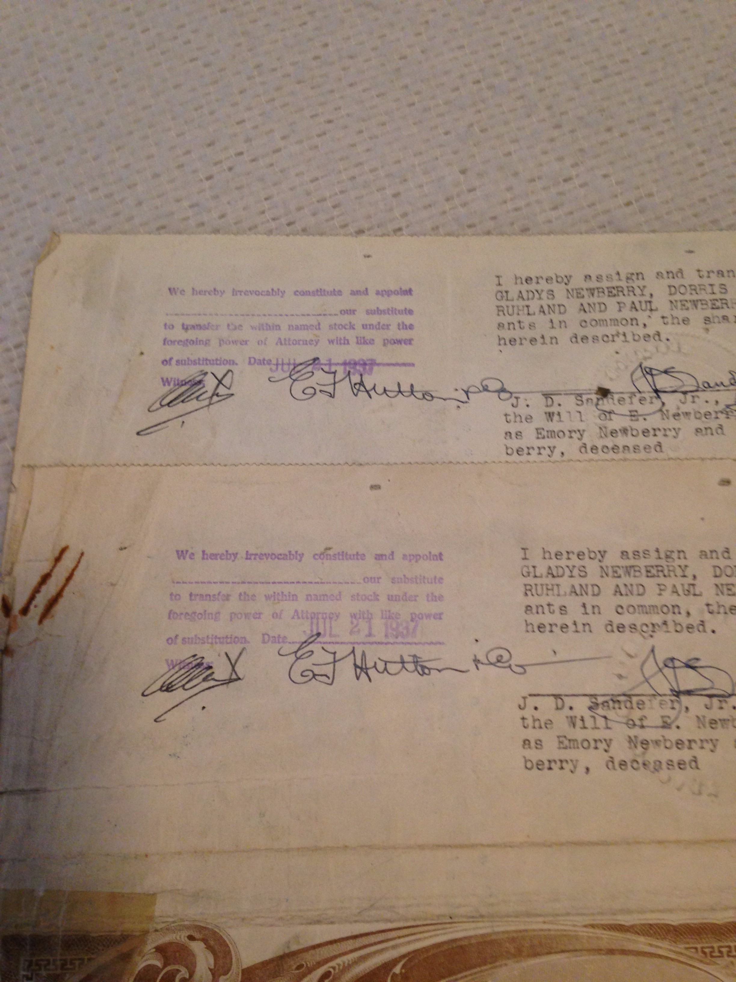 I found the E.F. Hutton signatures on the back of 2 seperate Erupcion Mining Co. stock certificates as part of a stock transfer dated July 21, 1937. One certificate for 100 shares has an issue date of March 22, 1923 and another certificate for 100 shares has a date of January 25, 1924.