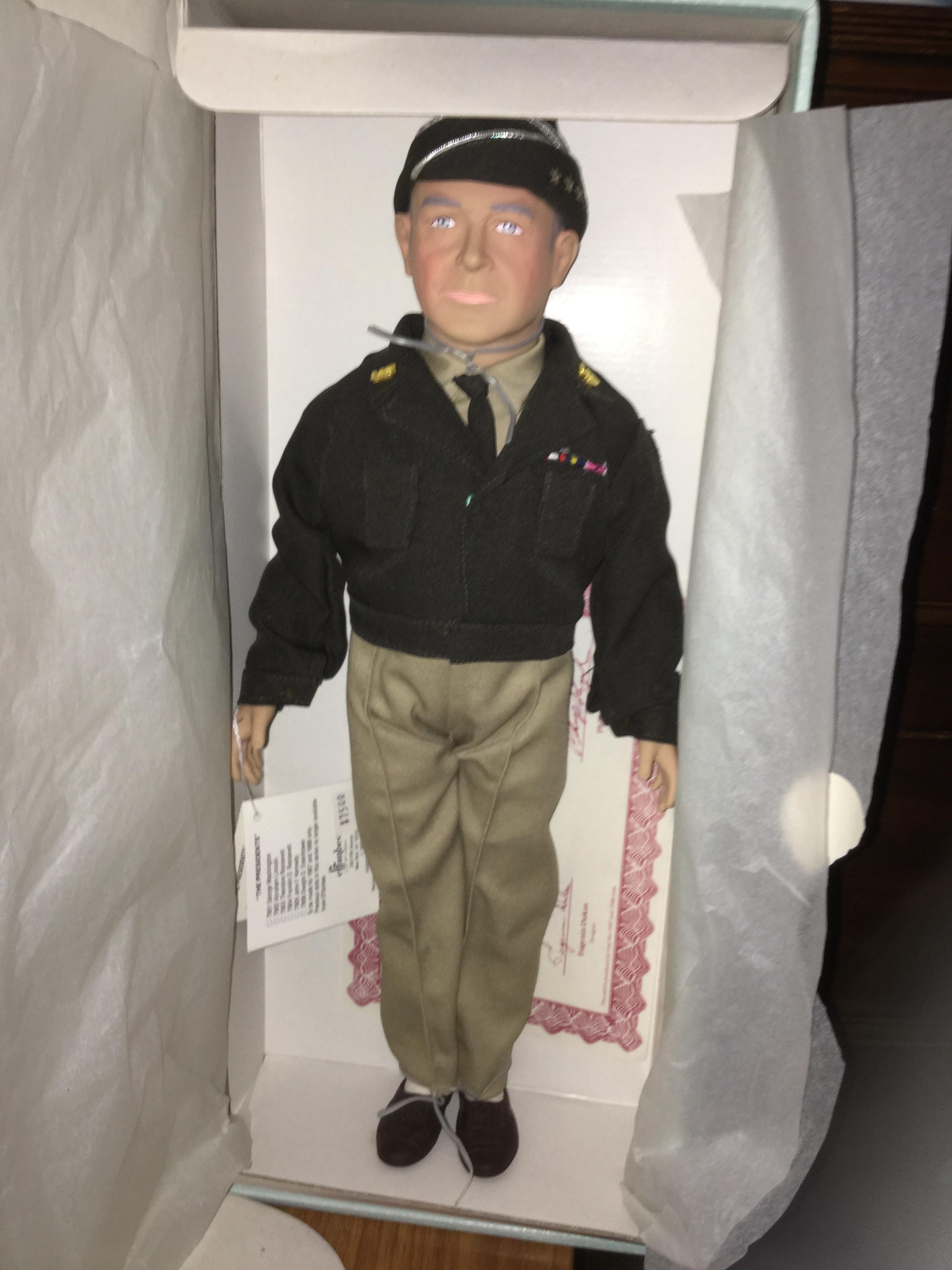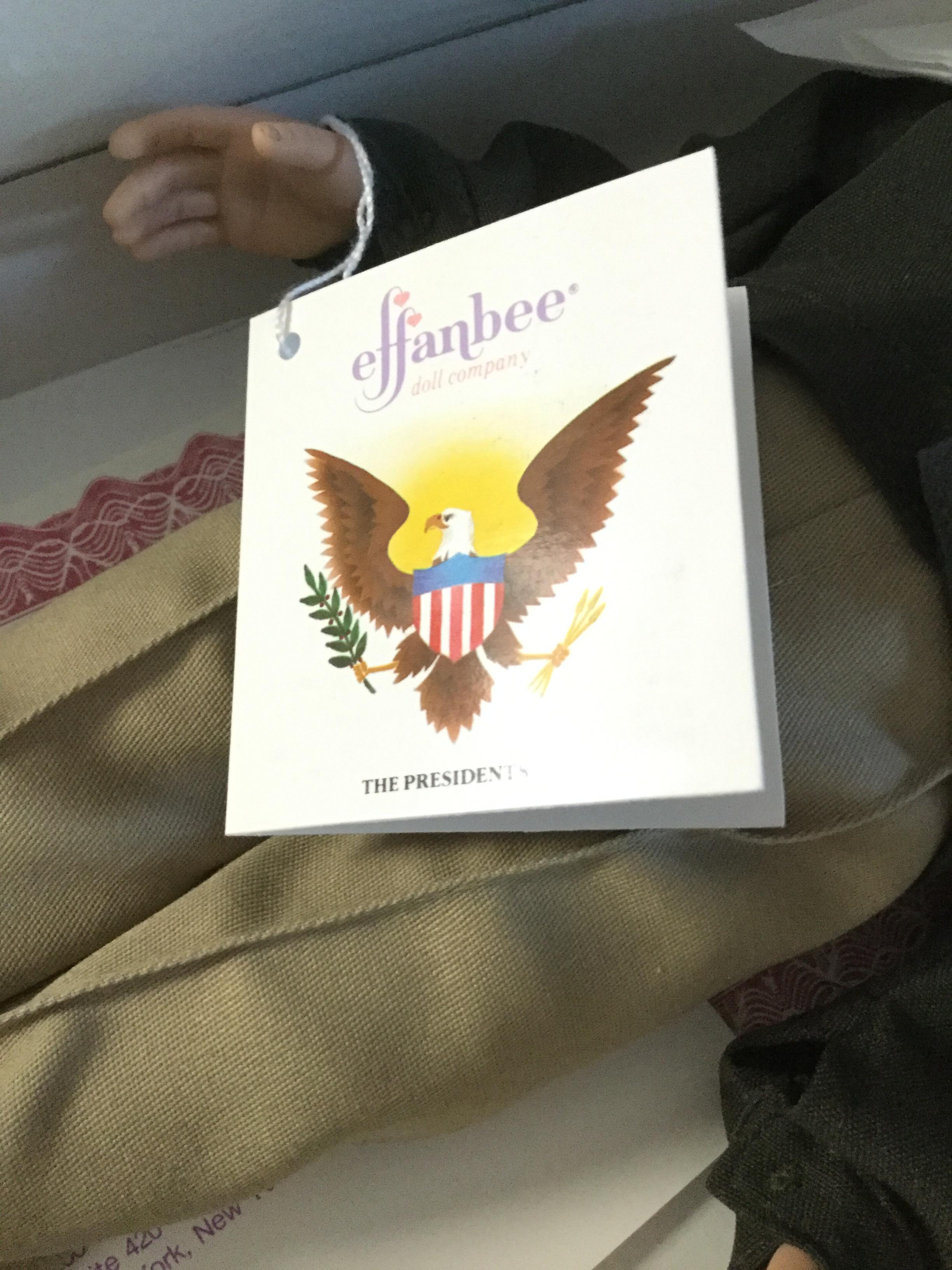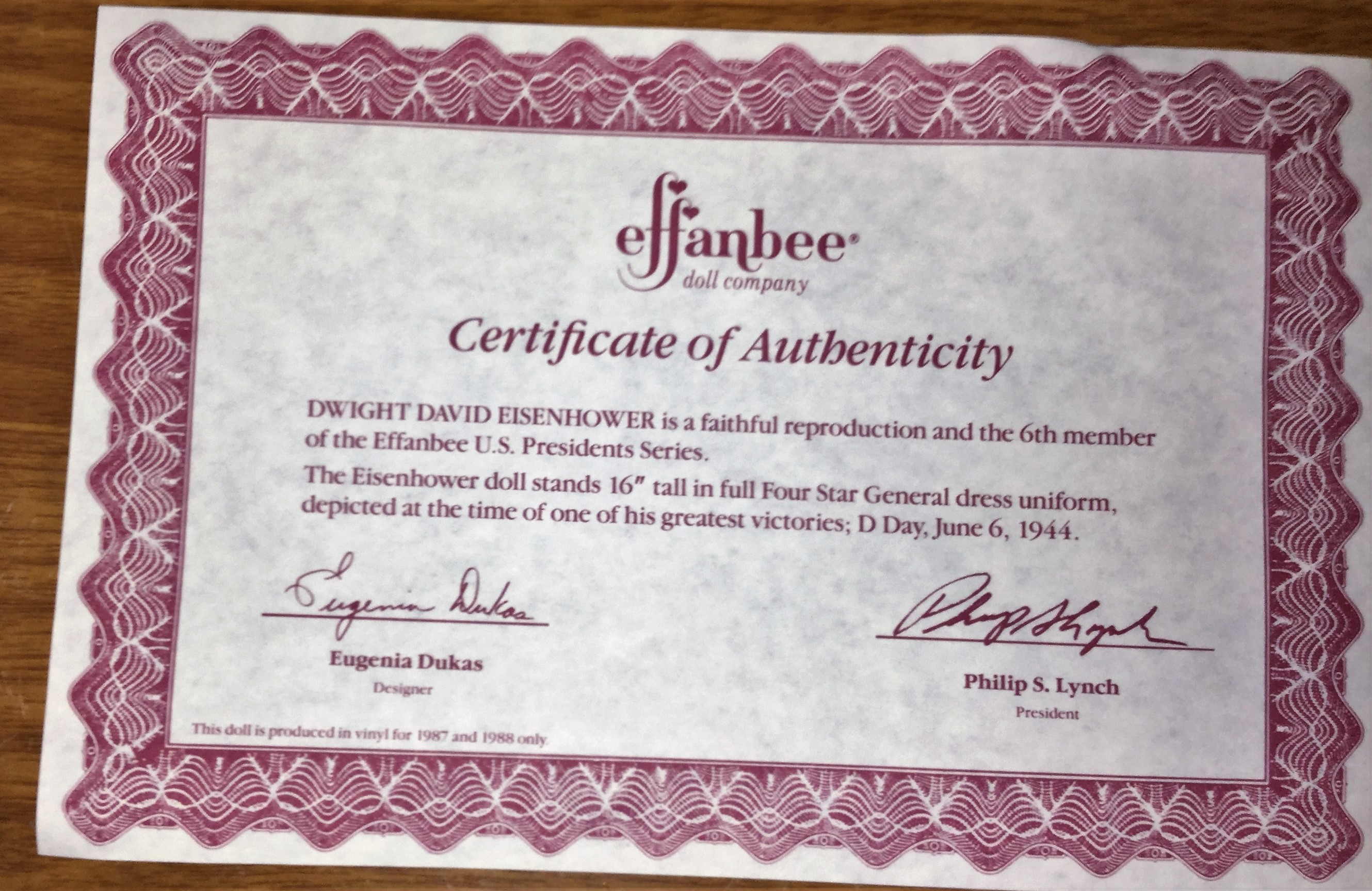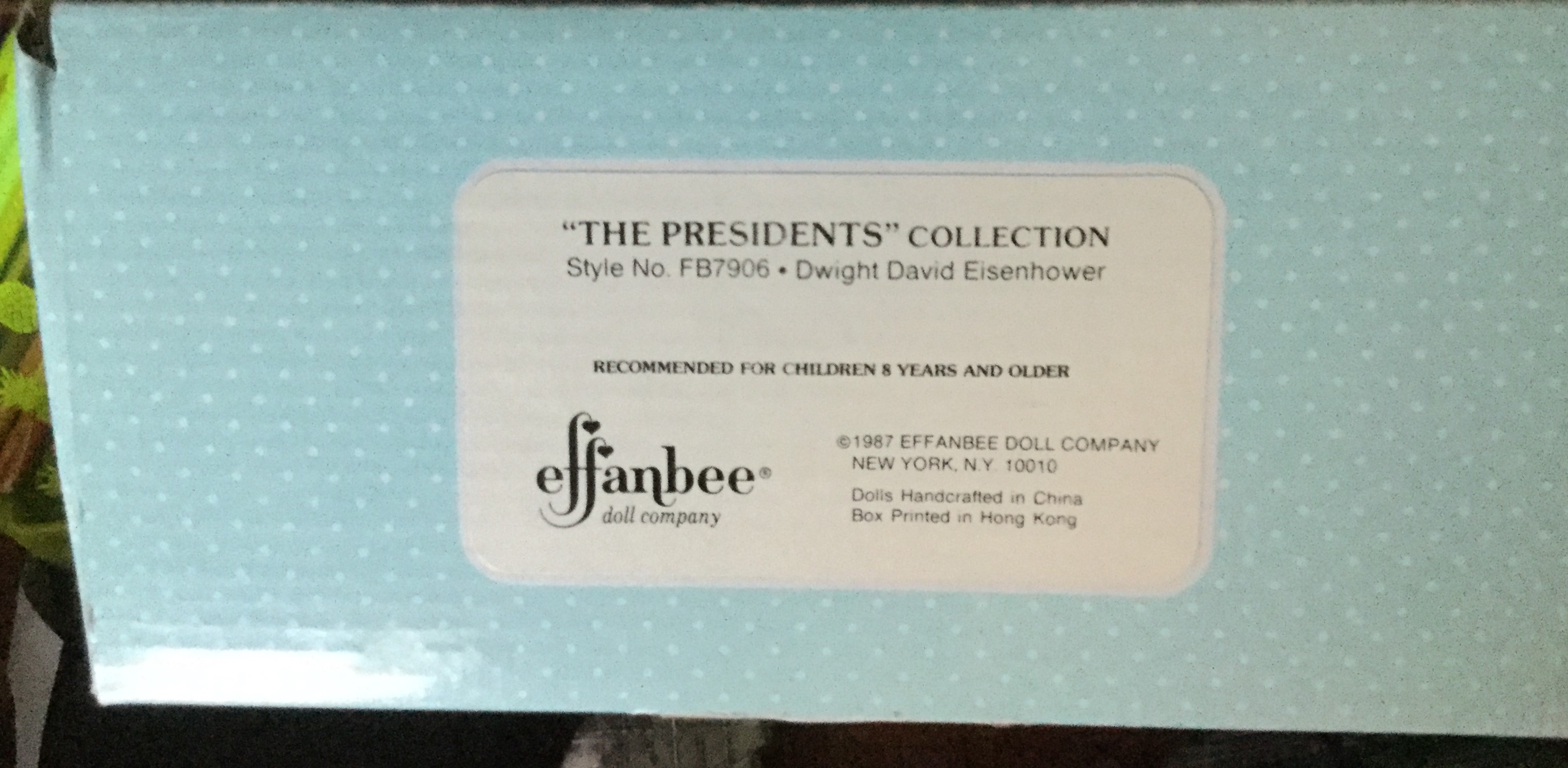 This doll to my knowledge has never been out of the box. It was bought at a store sometime in 1987-1988 by my grandfather. The box has original tags which read: "The Presidents" Collection Style No. FB7906 - Dwight David Eisenhower. The price on the box is $75. There is a small rip in the tissue paper surrounding the doll. The doll itself appears to be in or at mint condition and the originl ties are still attaching the doll at neck and feet. The doll comes with a Crtificate of Authenticy, which at the bottom states that the vinyl doll (which i assume this one is) was only made 1987 and 1988. My Grandfather has wishes to sell them however I am only concerned with its value at this point in time.