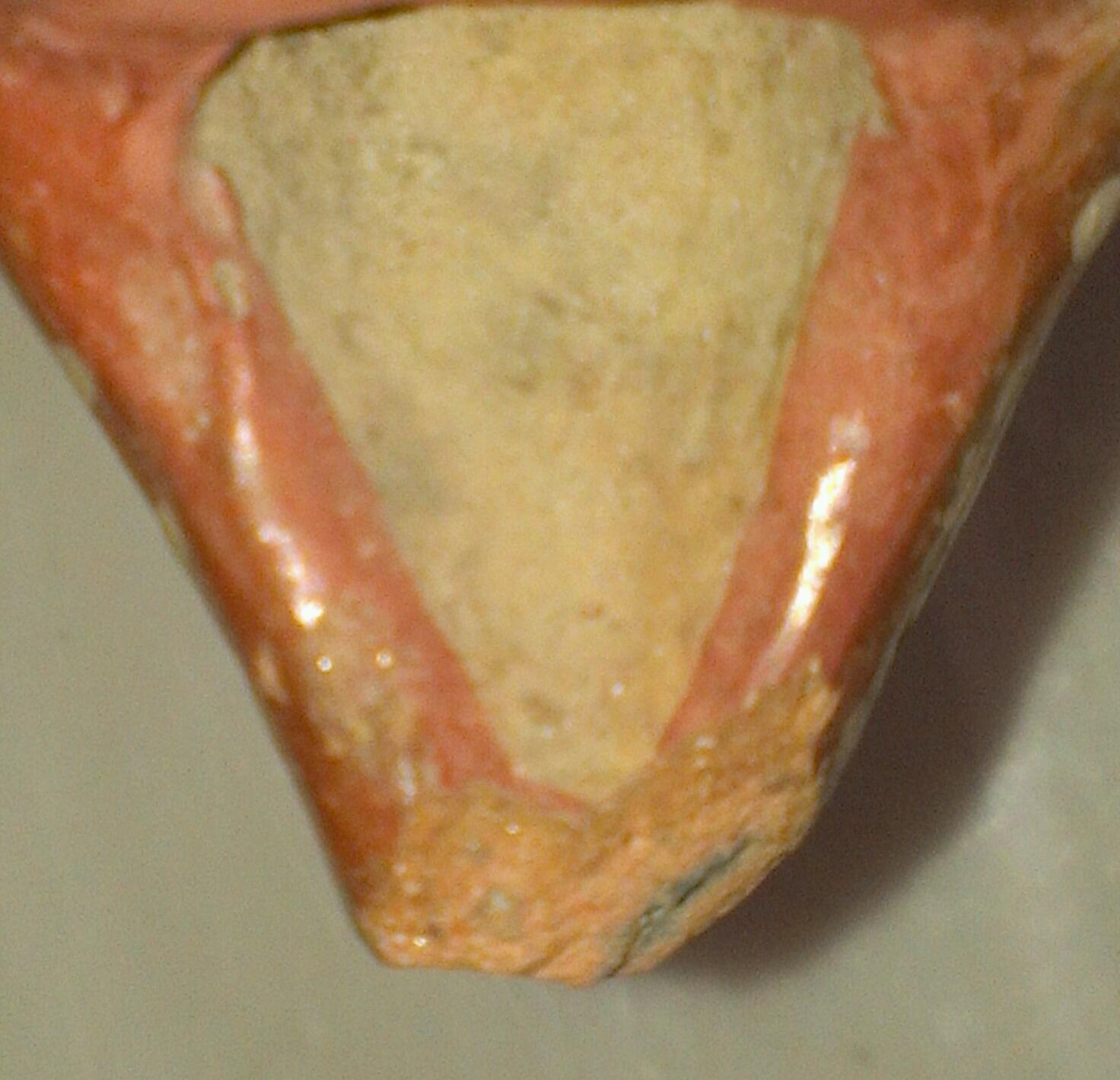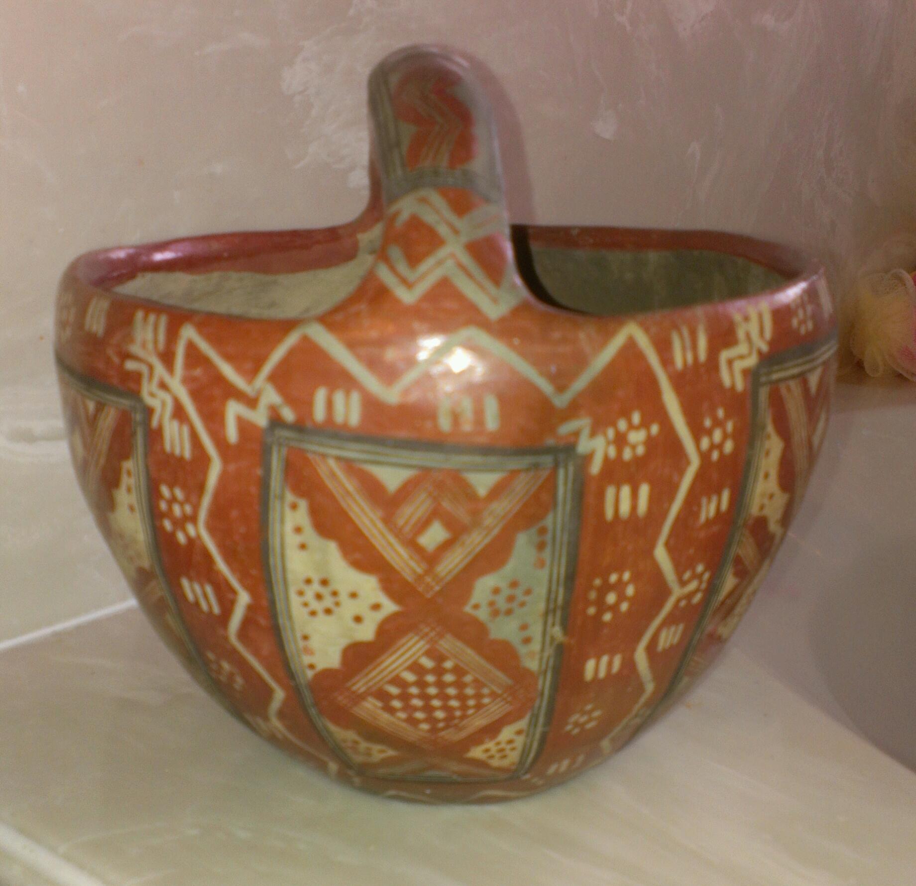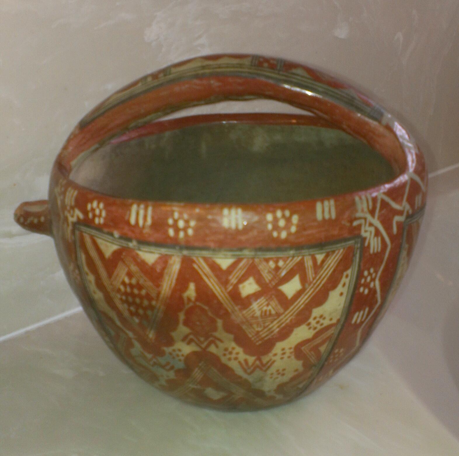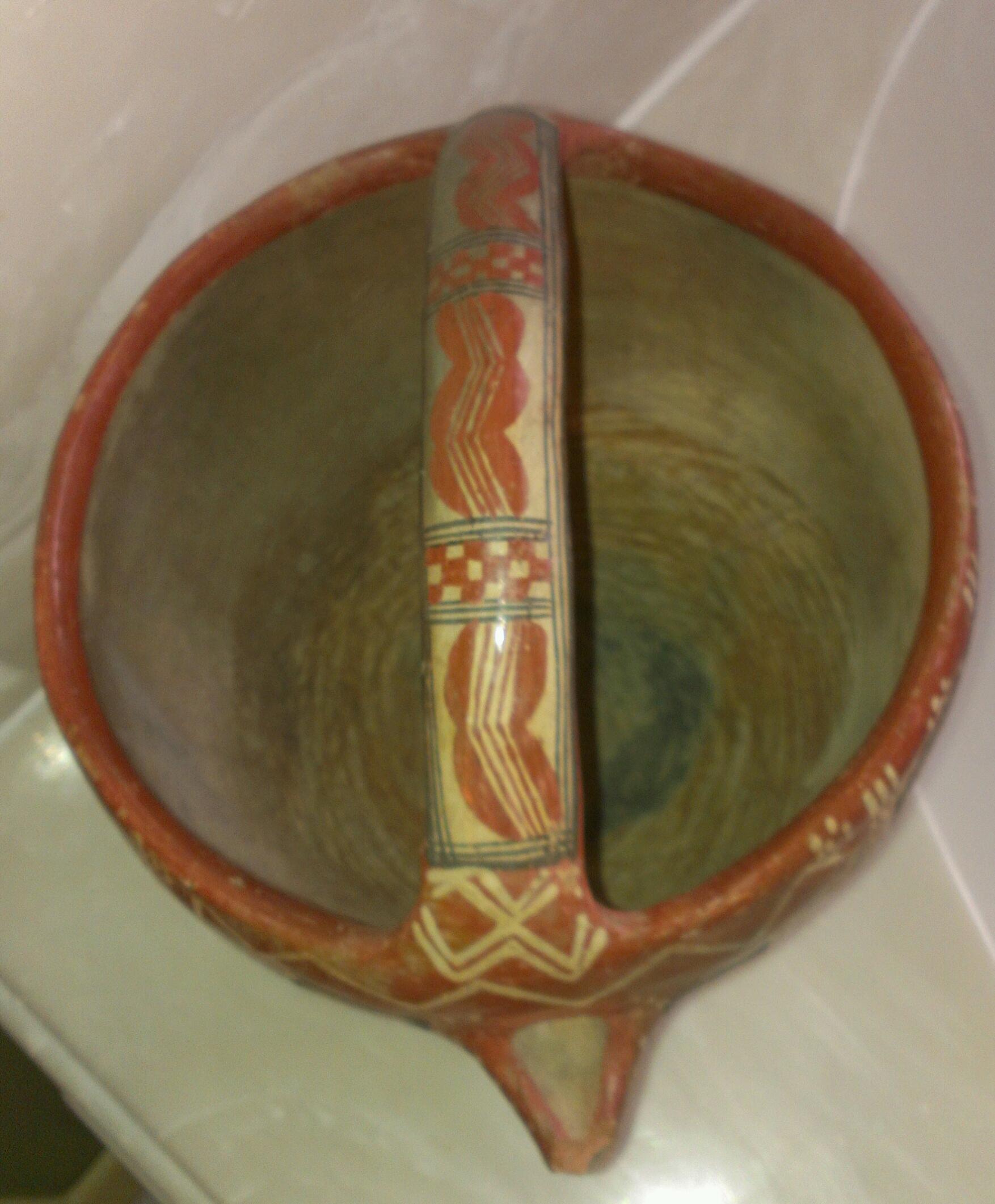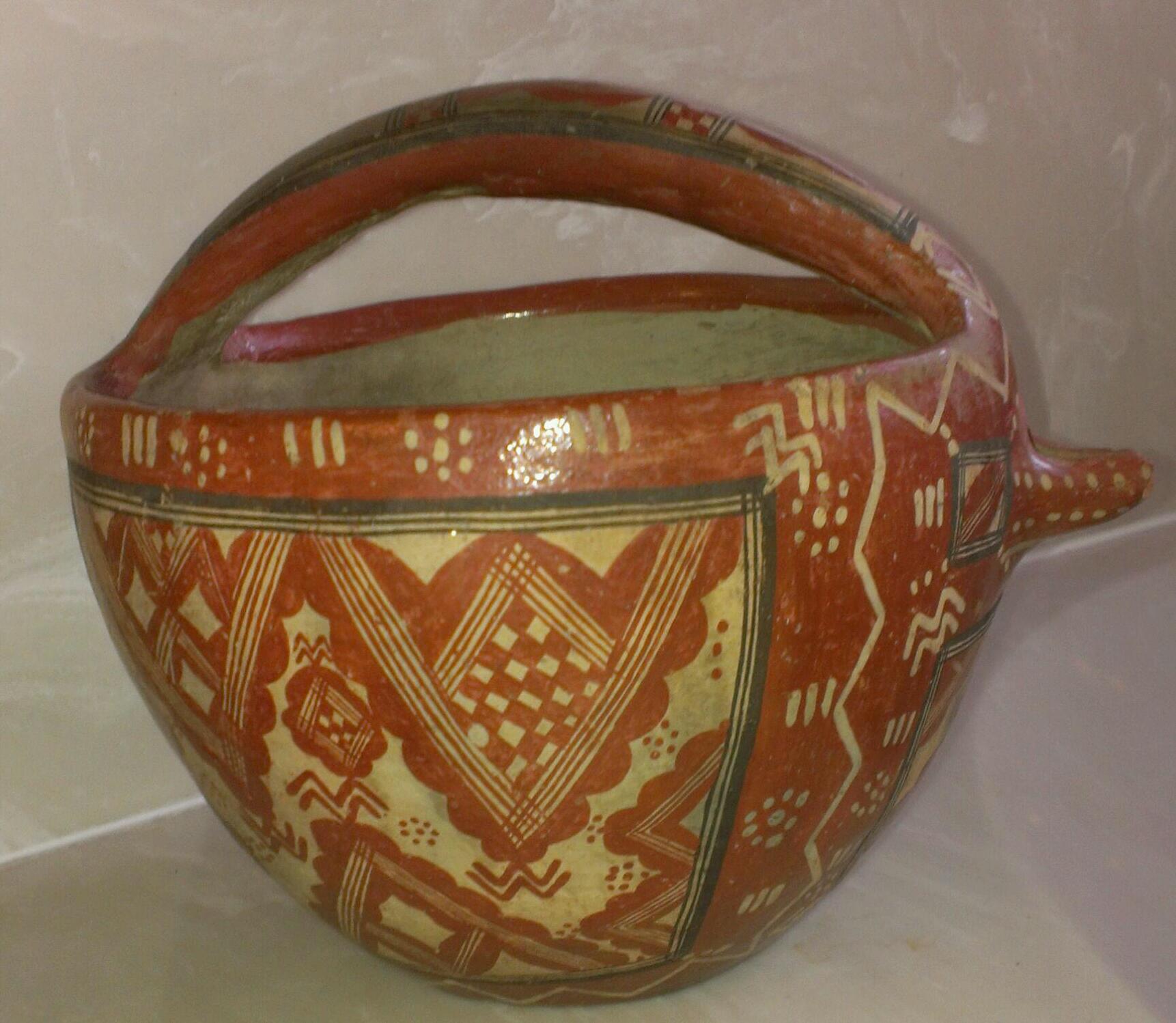 It seems to be a old pice of pottery. It has a handle and a spout. It is painted and seems to have burns on sides and bottom. It is red brown in color. The spout is chipped other than that is looks good for its possible age.