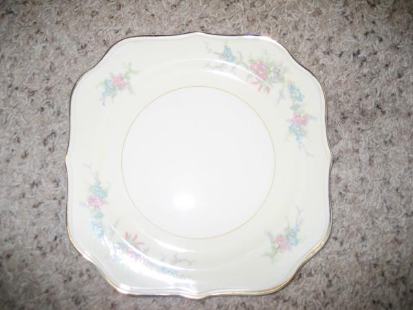 This set was passed down to me from my Great Grandmother's collection of china. I don't know how old it is but my grandmother and great aunt were only allowed to use this china for exceptional occasions otherwise it was stored in a glass fronted china cupboard. There is a tea pot, creamer, sugar bowl, gravy boat, 12 tea cups with saucers, 12 dinner plates, 12 square shaped plates, 2 large serving bowls, 3 medium serving dishes, 5 serving plates in assorted sizes, 12 medium shaped plates (bread and butter?). All together there are 74 pieces. The sugar bowl and teapot have lids and are in very good condition. Very few of the plates look used.