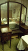 Art Deco (I believe) Eglomise Reverse Painted Mirrored Desk Vanity Purchased at Chicago Merchandise Mart estimated to be in 1940's. Overall in good condition, but some discoloration on the mirror (located on sides of desk).