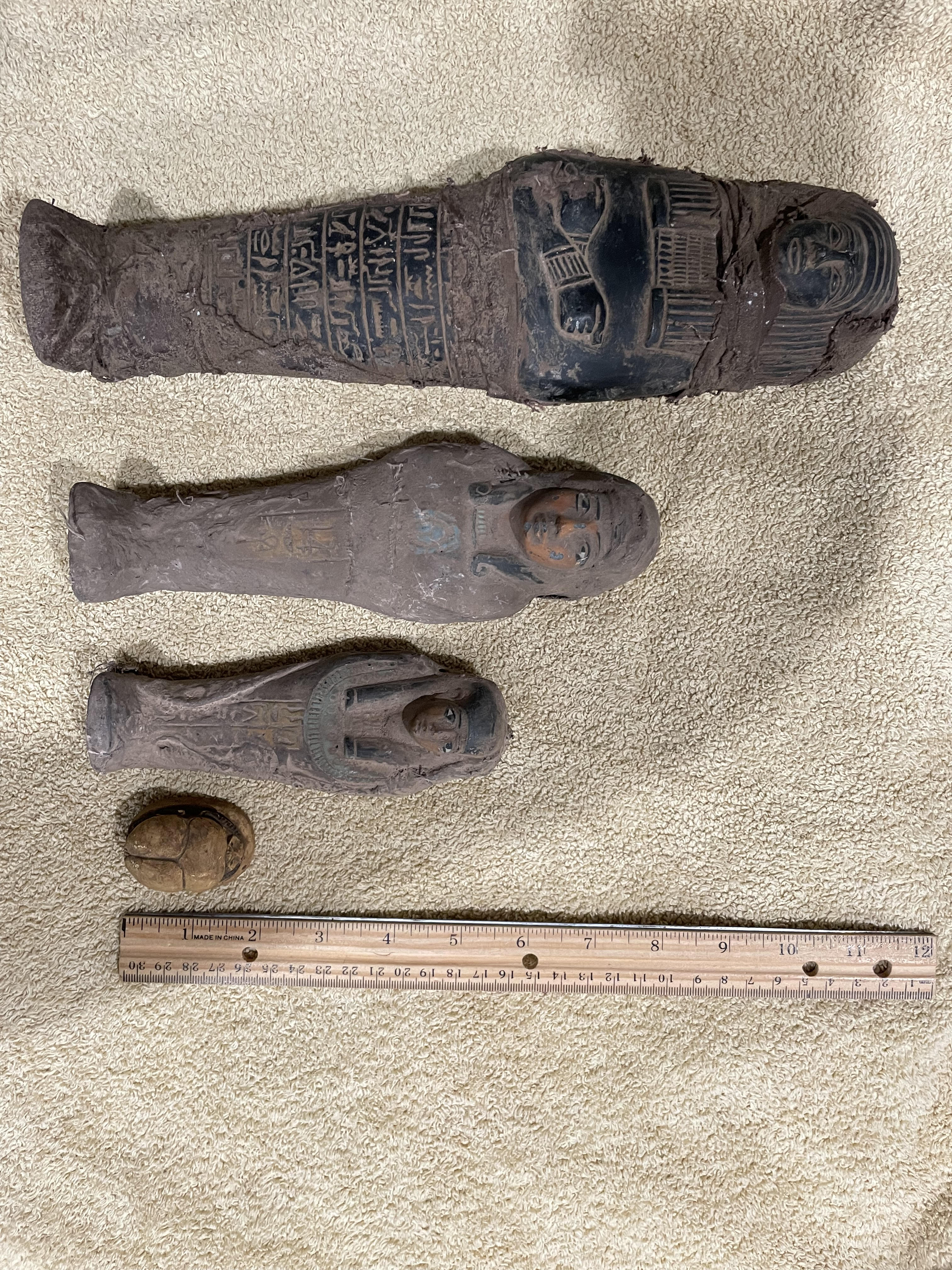 Three Ushabti and a scarab supposedly from a avid collector's recent estate sale in ATL, GA. I purchased them from a local antique store. He admitted he knows zero about them, so I am not sure of anything. Please, please, please give me any information you have. Are they even legitimate? I appreciate any and all input.