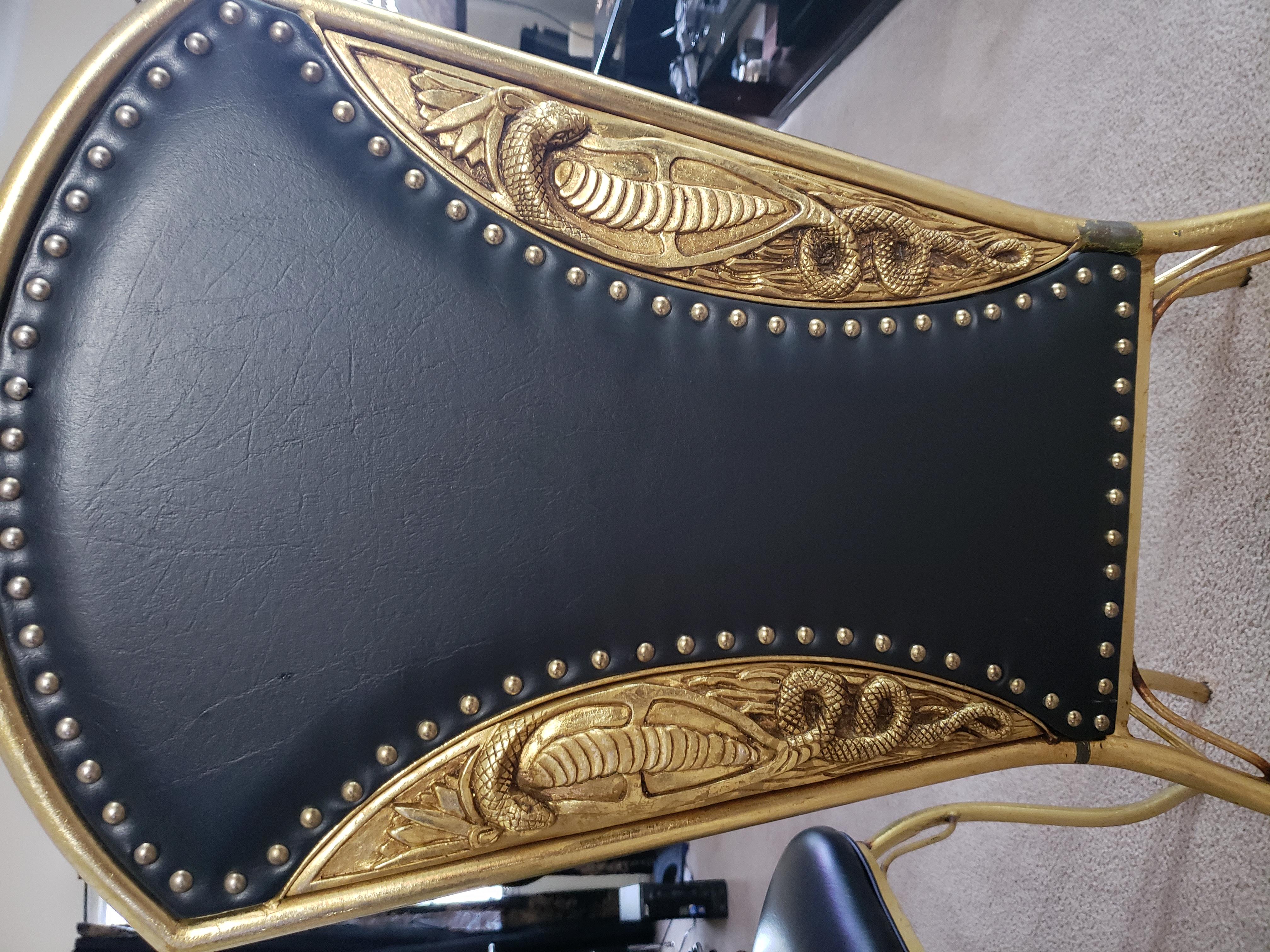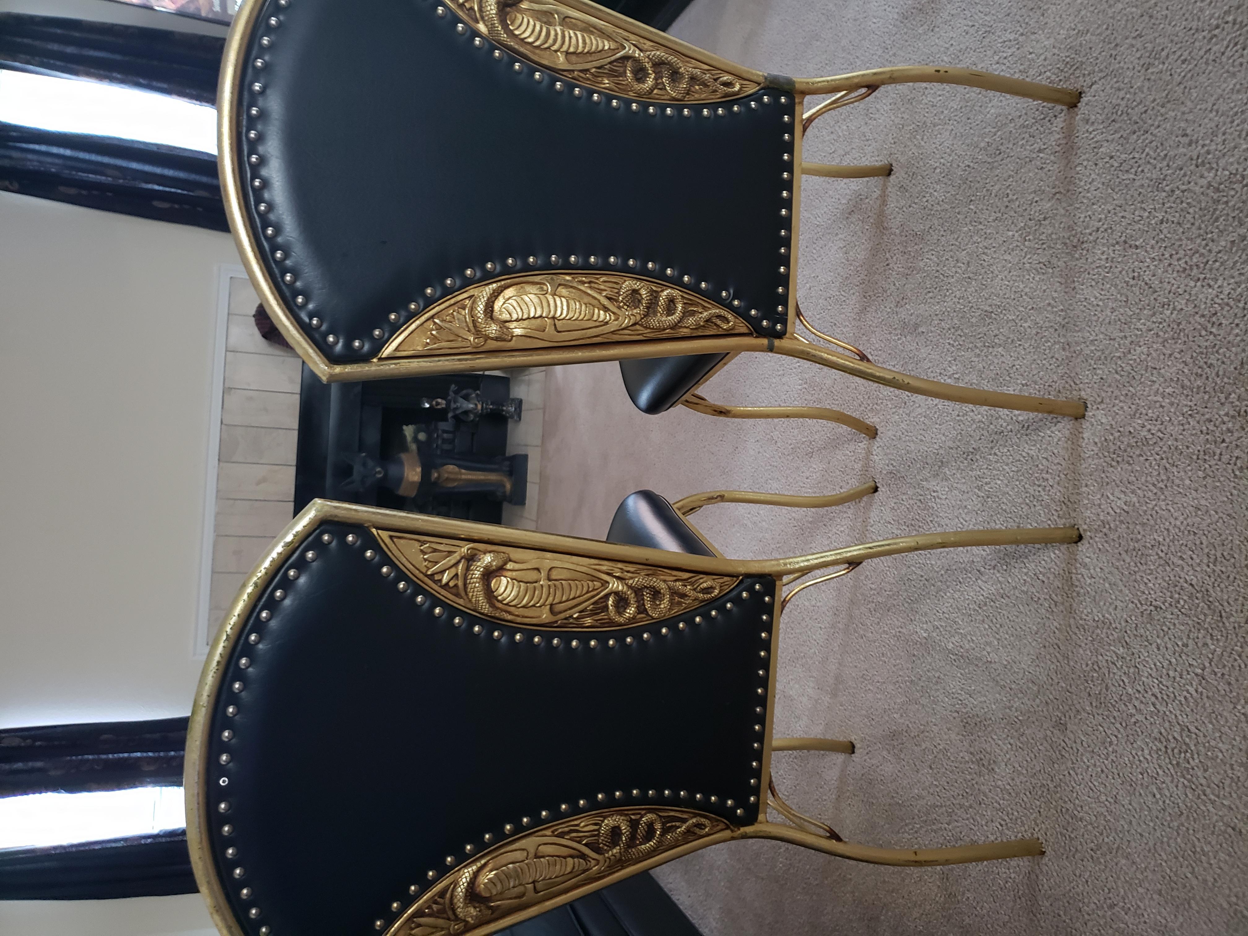 Black and gold gilted Egyptian chairs with intricate snake design on front and back.
