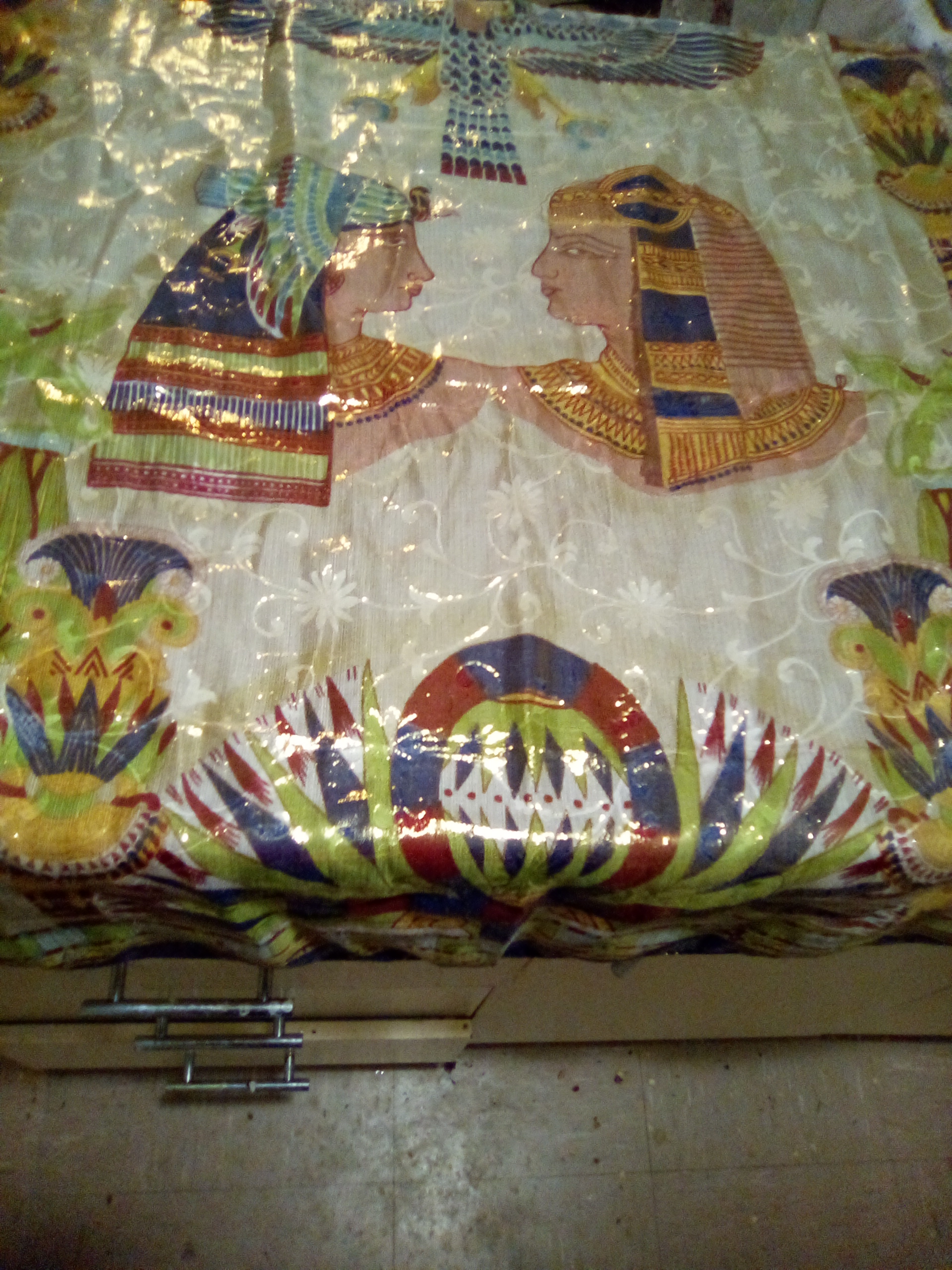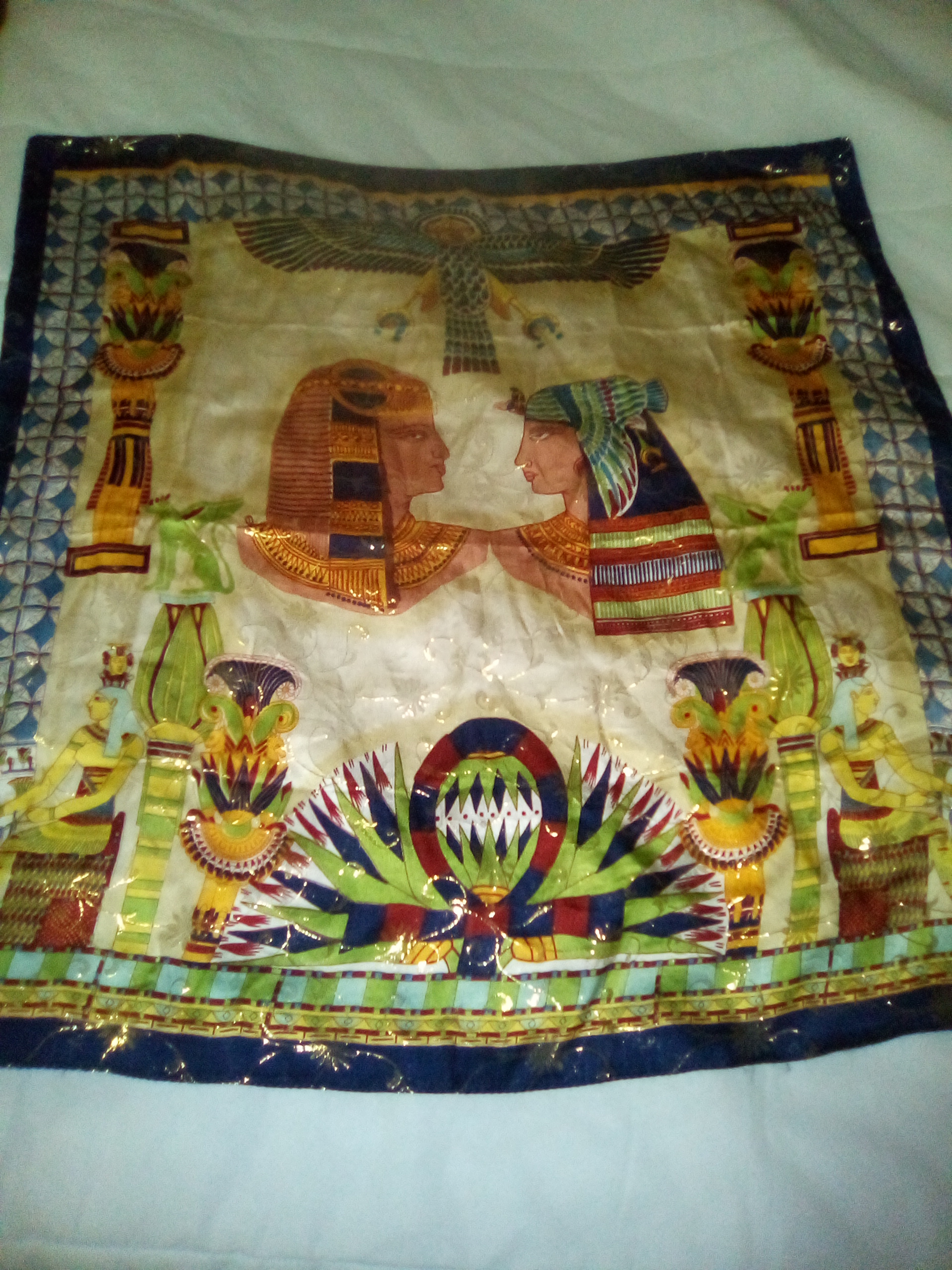 This is an Egyptian 100% silk scarf that is 90cm square in dimension. It is a very colourful scarf with a god and goddess imprinted in it.