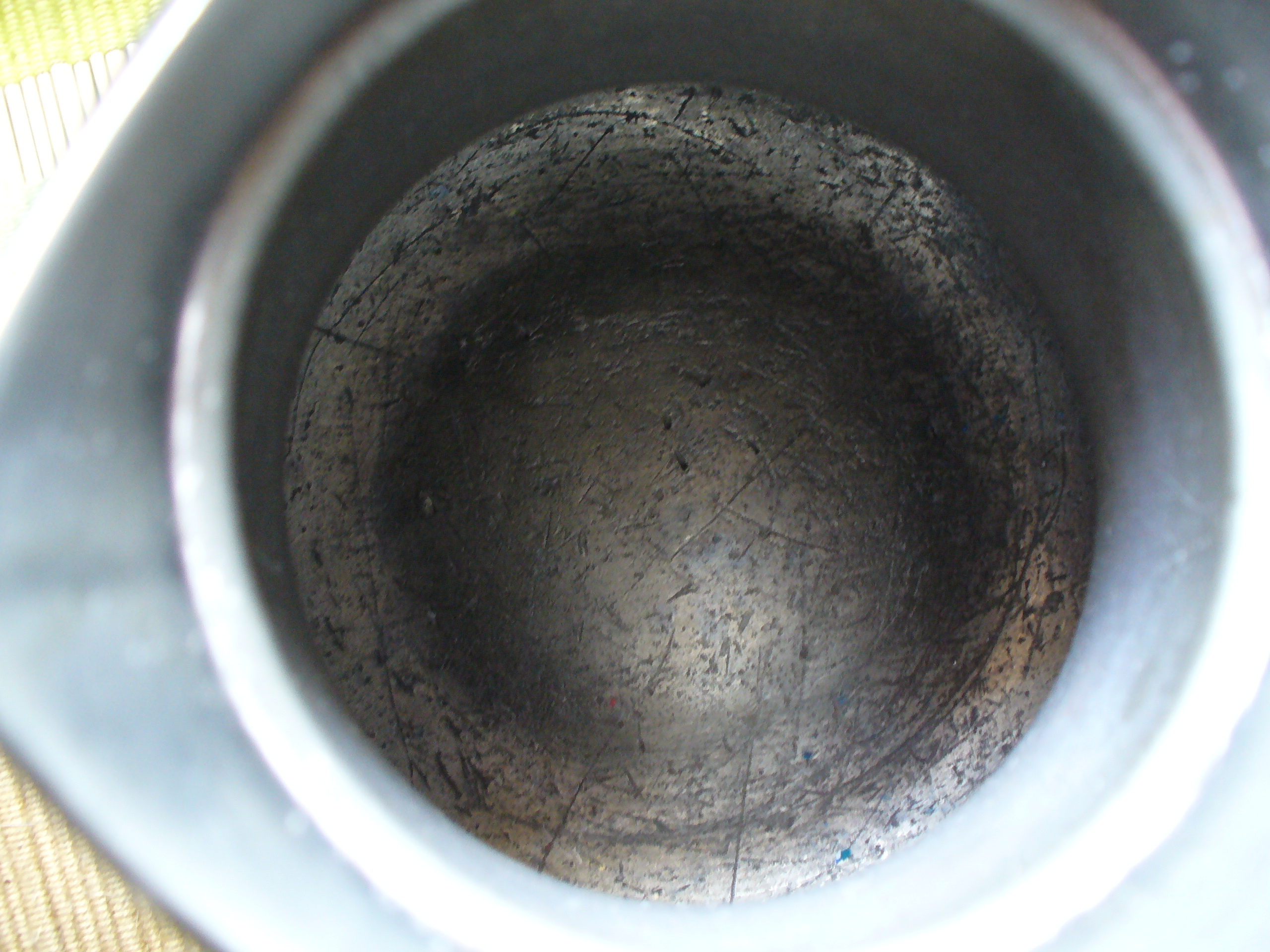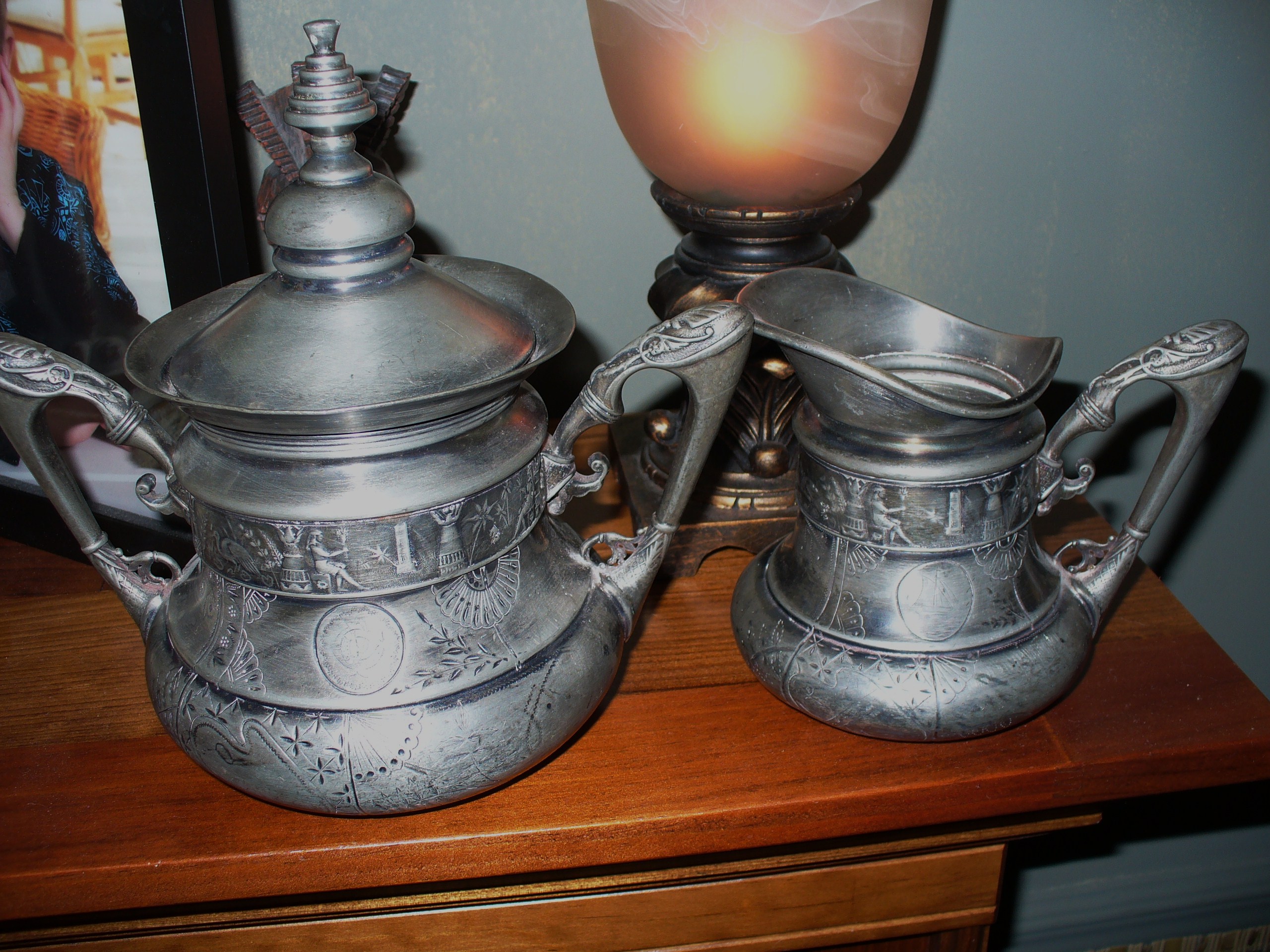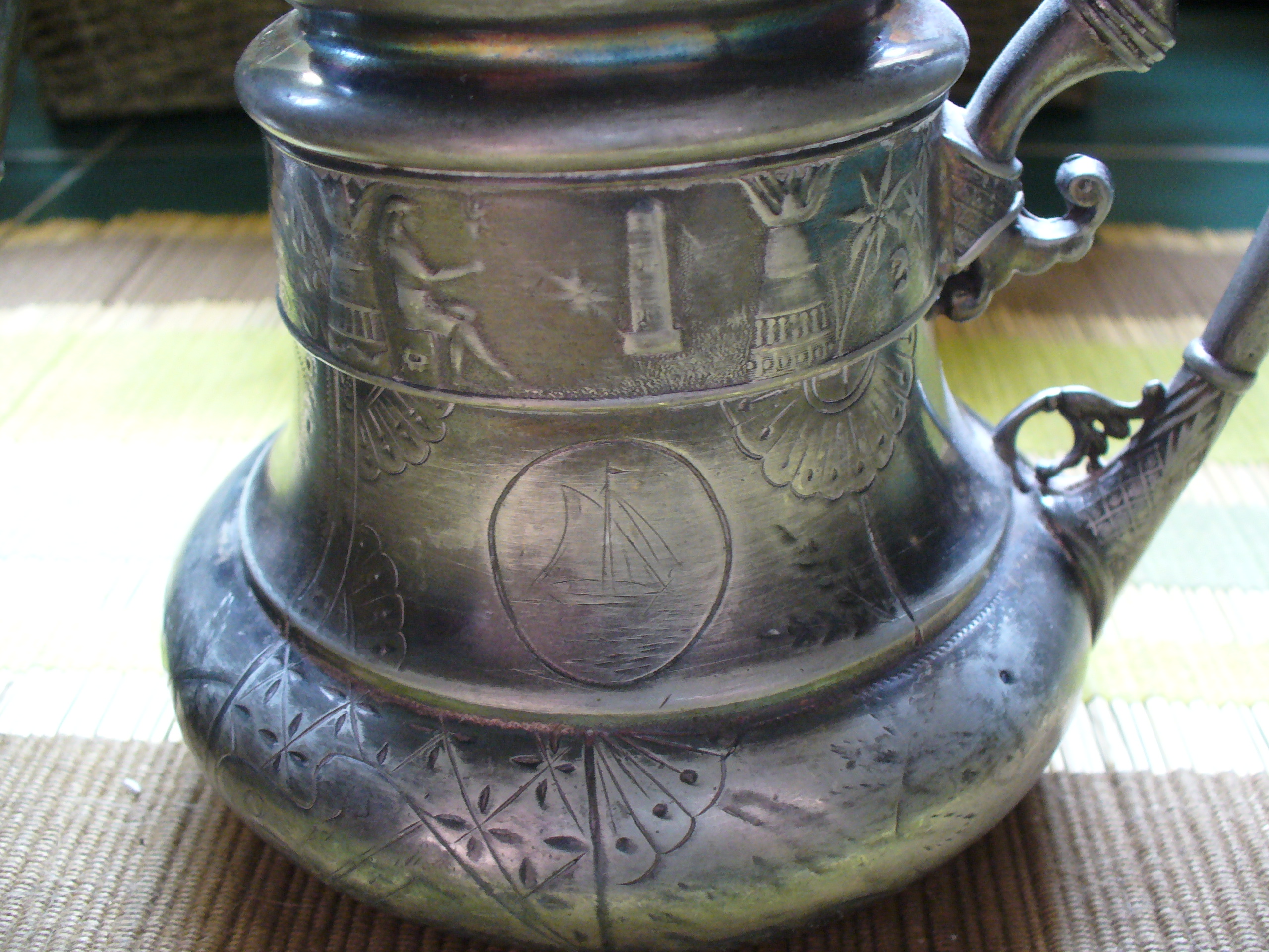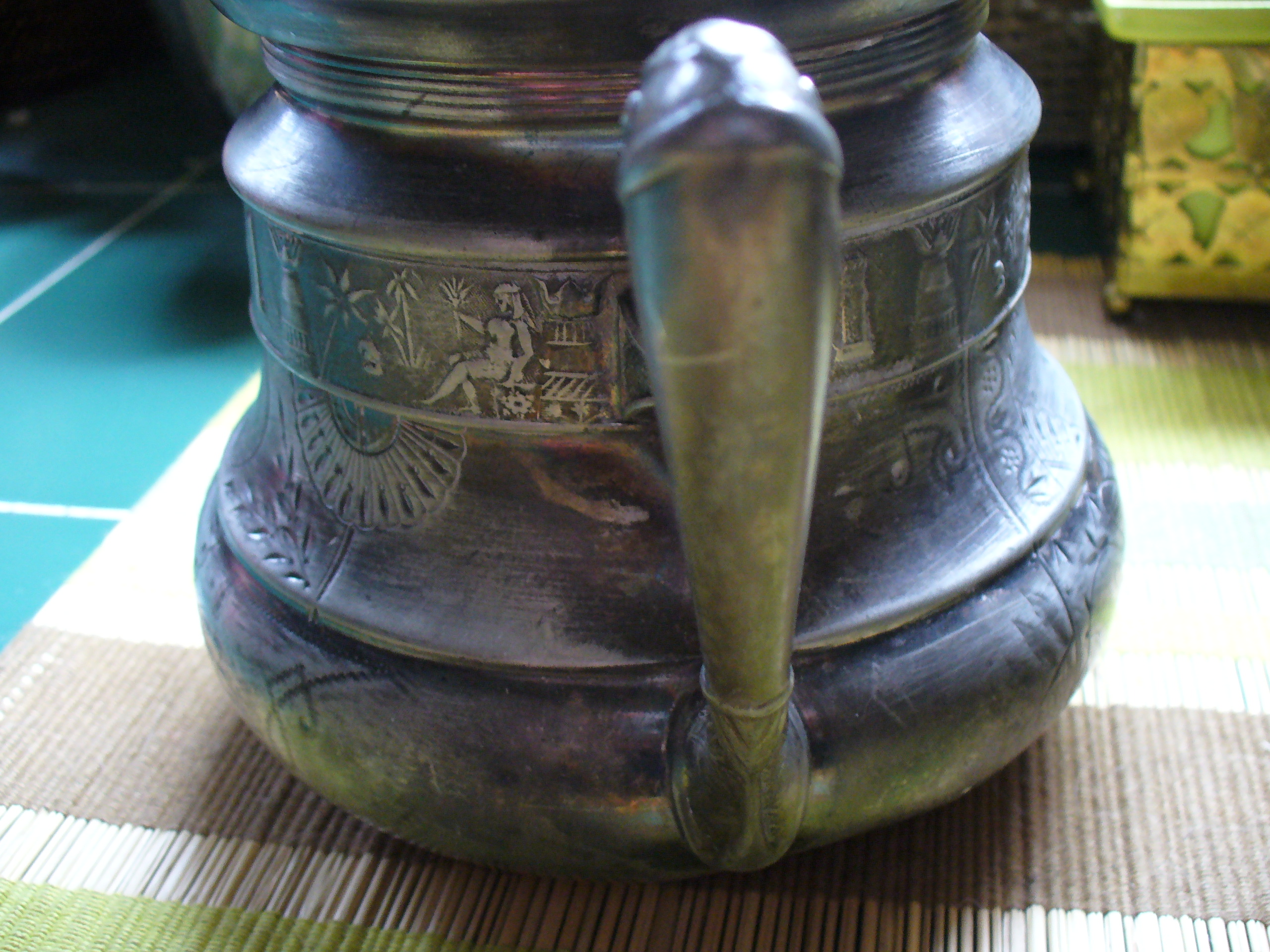 Has heiroglyphics around the middle and ornate lid and handles, with a faint stamp on the bottom. All I can see is a circle with Derby Silver around it.