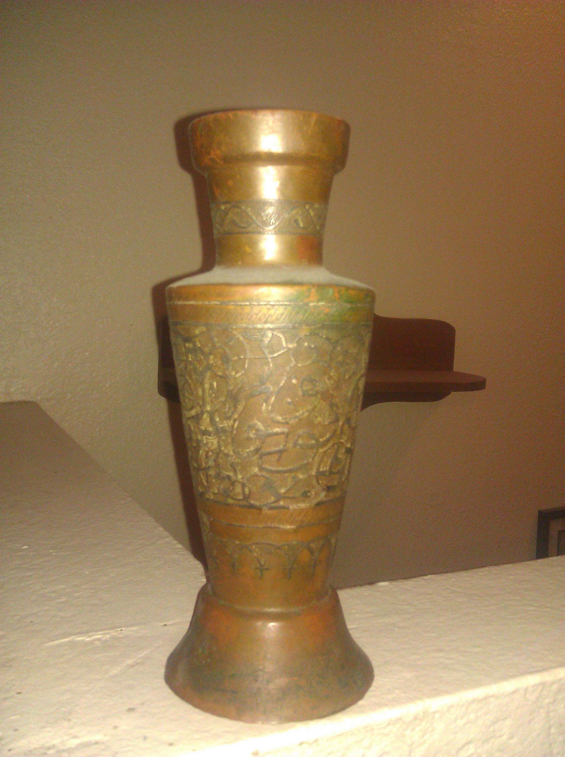 I have an Egyptian vase that my grandfather purchased while in Egypt. I beleive that the vase is bronze with many markings all over it. It is about one foot tall.