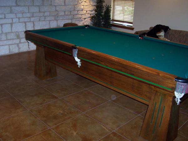 Table is in excellent condition. It has 3 pieces of 1 1/2 " slate . Cushions are very lively and wood rails and legs are enormous!!!. This has been in my family since the early 50's. I have no one to pass on to so will be selling it .