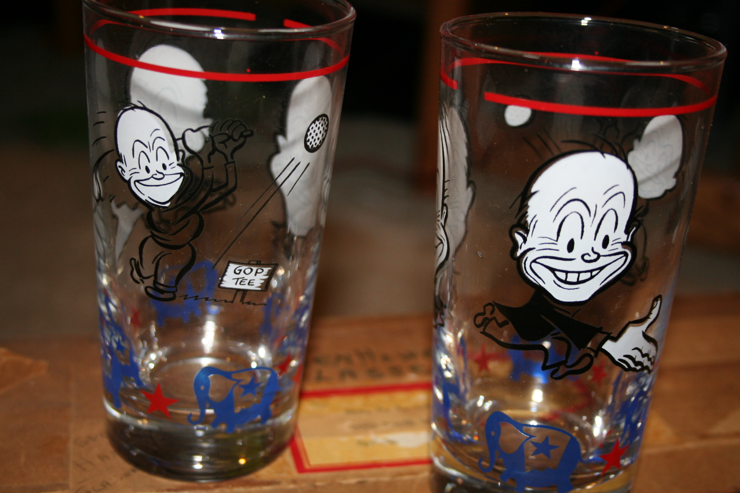 Set of eight Eisenhow campaign glasses in perfect condition. They are still in the original shipping box from 1957. I might be interested in selling them.