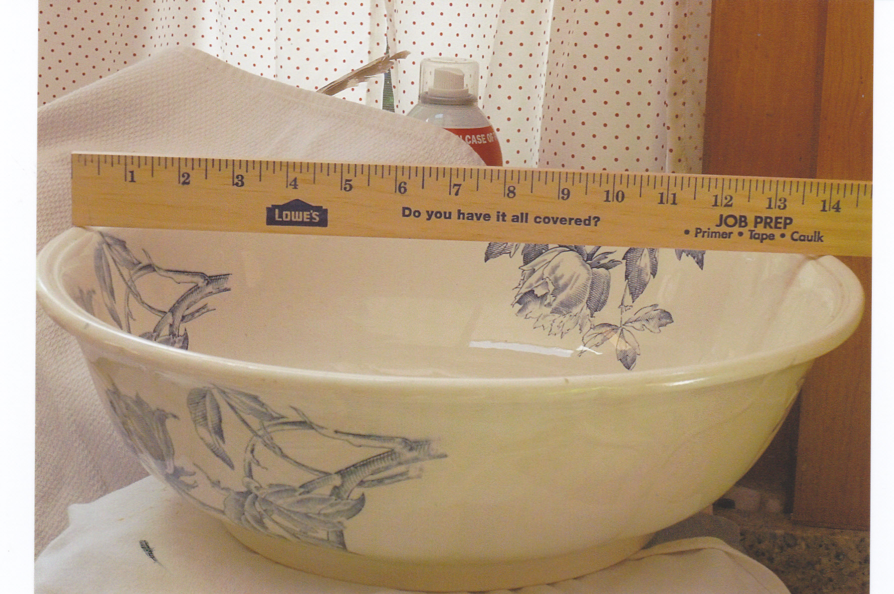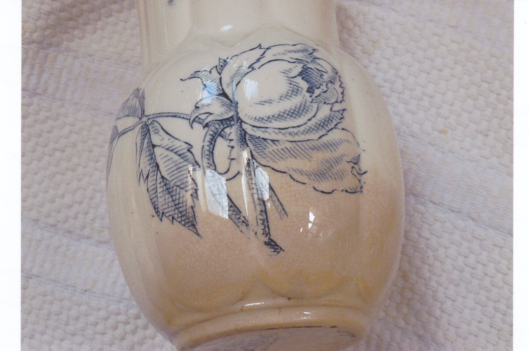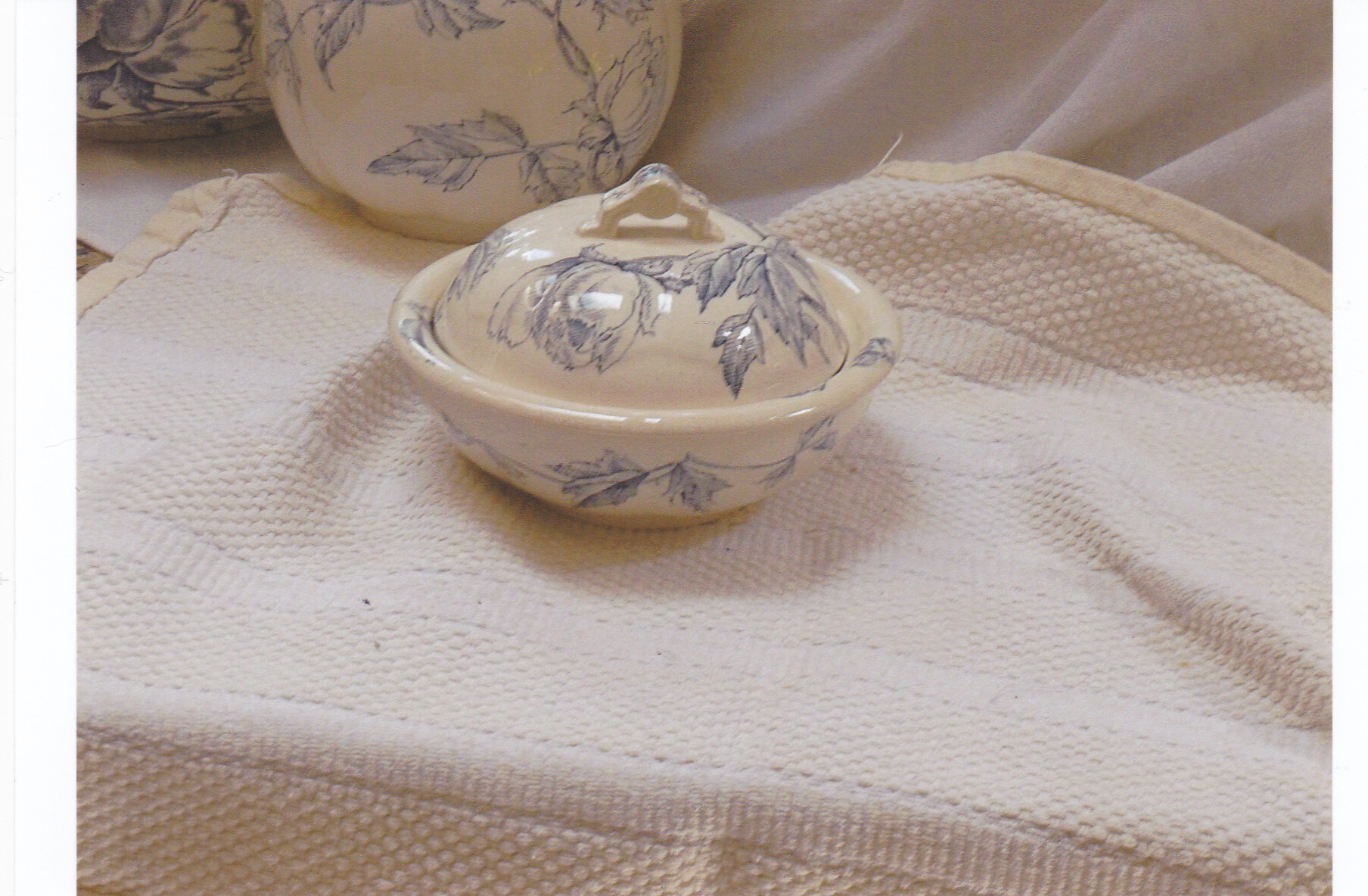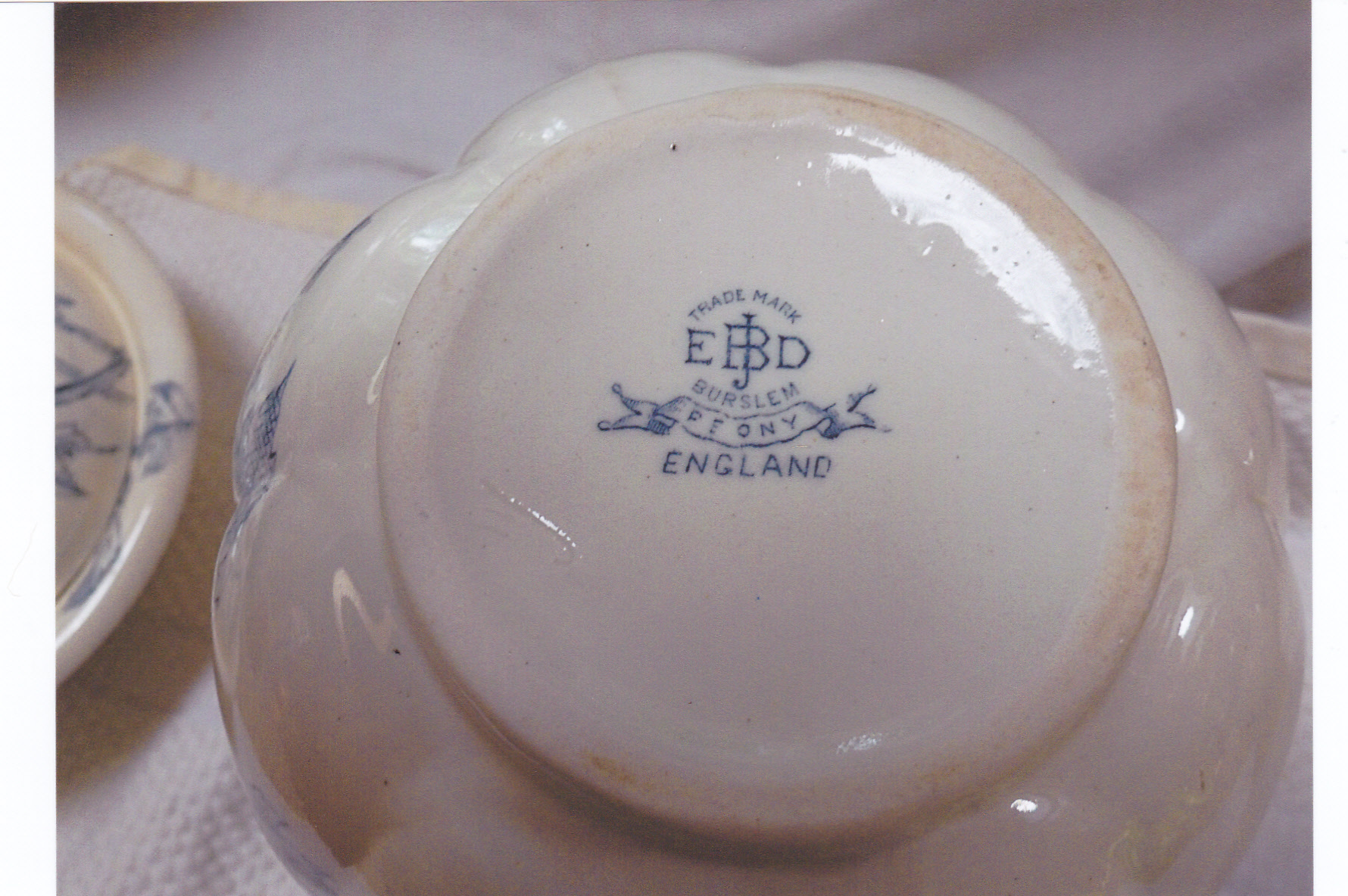 This set was handed down from one family member to the next. The bowl is about 13 1/2 inches to 14 inches across. The pitcher stands about 10 inches tall. In addition to those two pieces, there is a smaller pitcher, chamber mug, cup, some sort of three piece soap dish, and a smaller "vase". Maybe the vase is a toothbrush holder - not sure. The color is an offwhite with a pale blue design and the bottom states it is "Peony" design. All the pieces are in excellent shape, no chips or cracks. The only piece that has a problem is the one I call the "vase". It has a light brown colored stain that is underneath the top layer of the glaze. You can look at the last two pictures that are attached to see what I am referring to. I understand that the EJD Bodley factory closed in 1898 so this gives me an idea of the age of this set. I have been holding on to this set for many years and I am trying to downsize so I would like to get any information available on this item so if I decide to sell, I have an idea of value. Any help would be appreciated and any questions, I will gladly try to answer. Thank you all.
