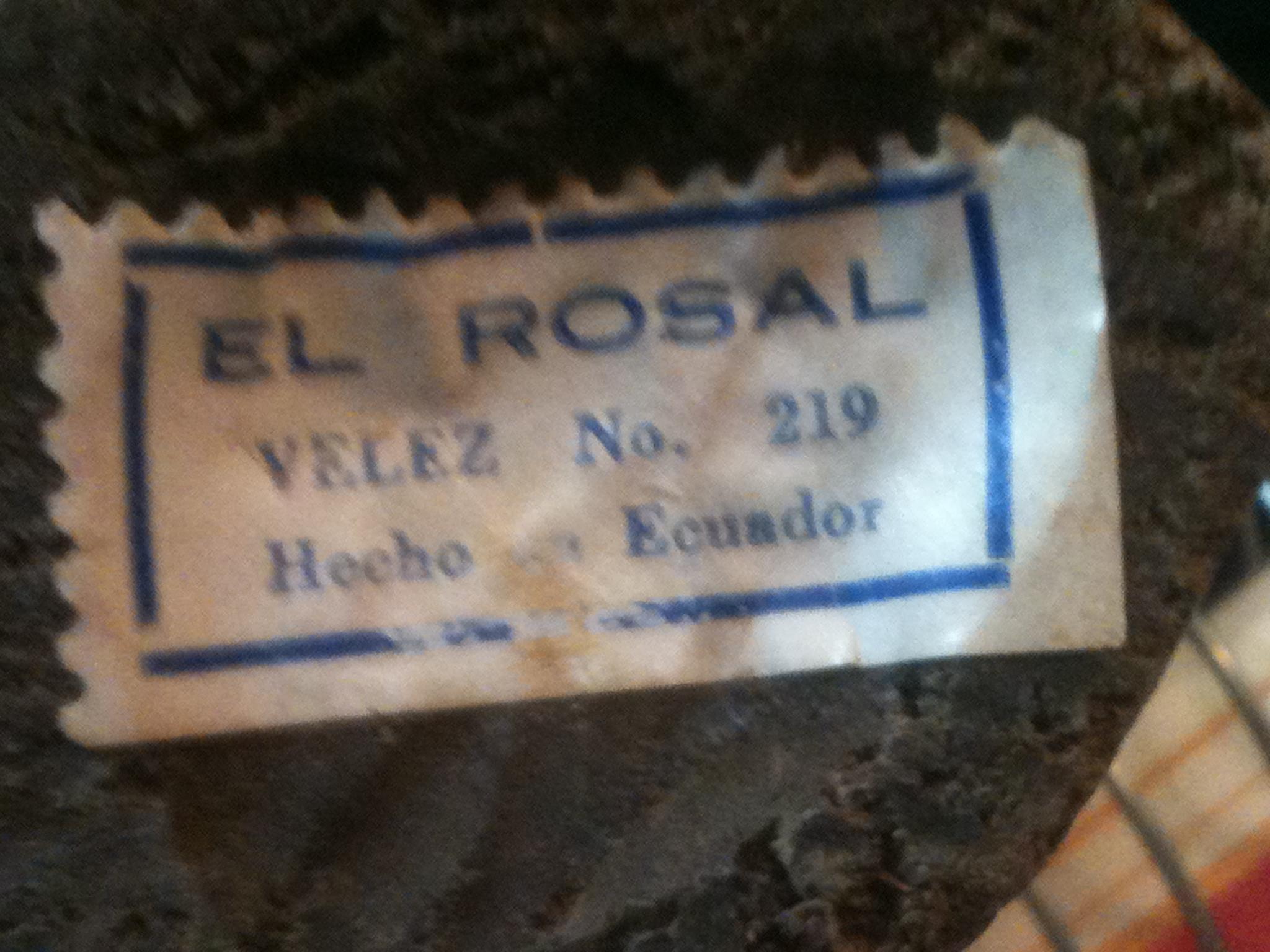 I have a hand carved figurine about 6 inches tall. It is possibly of a spaniard man, or mariachi member, playing a guitar. He is wearing typical spaniard attire, hat folded upwards, short capri-like pants, ponytail, etc. On the bottom, there is a label that reads "EL ROSAL. Velez. No 219. Hecho en Ecuador".