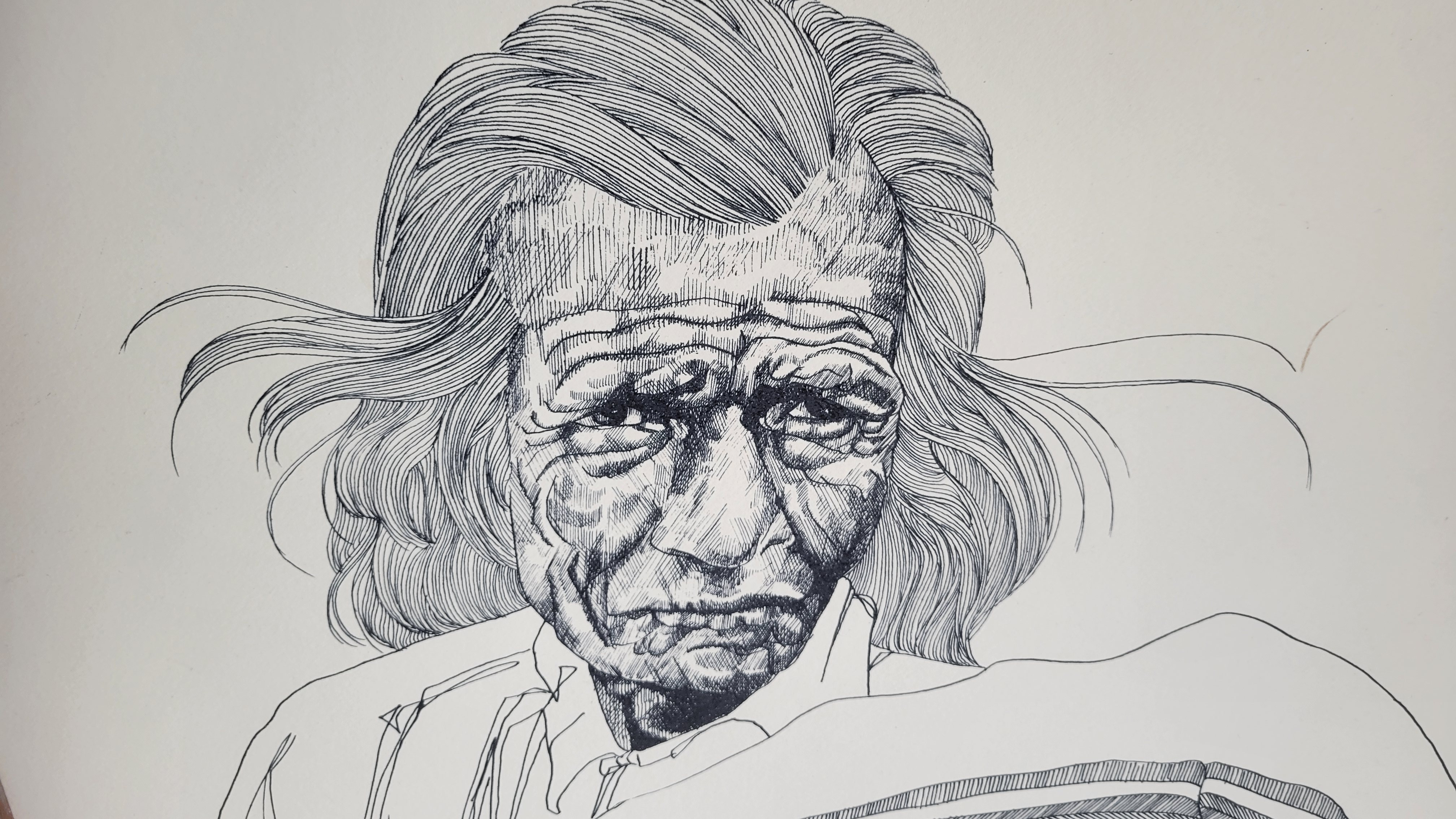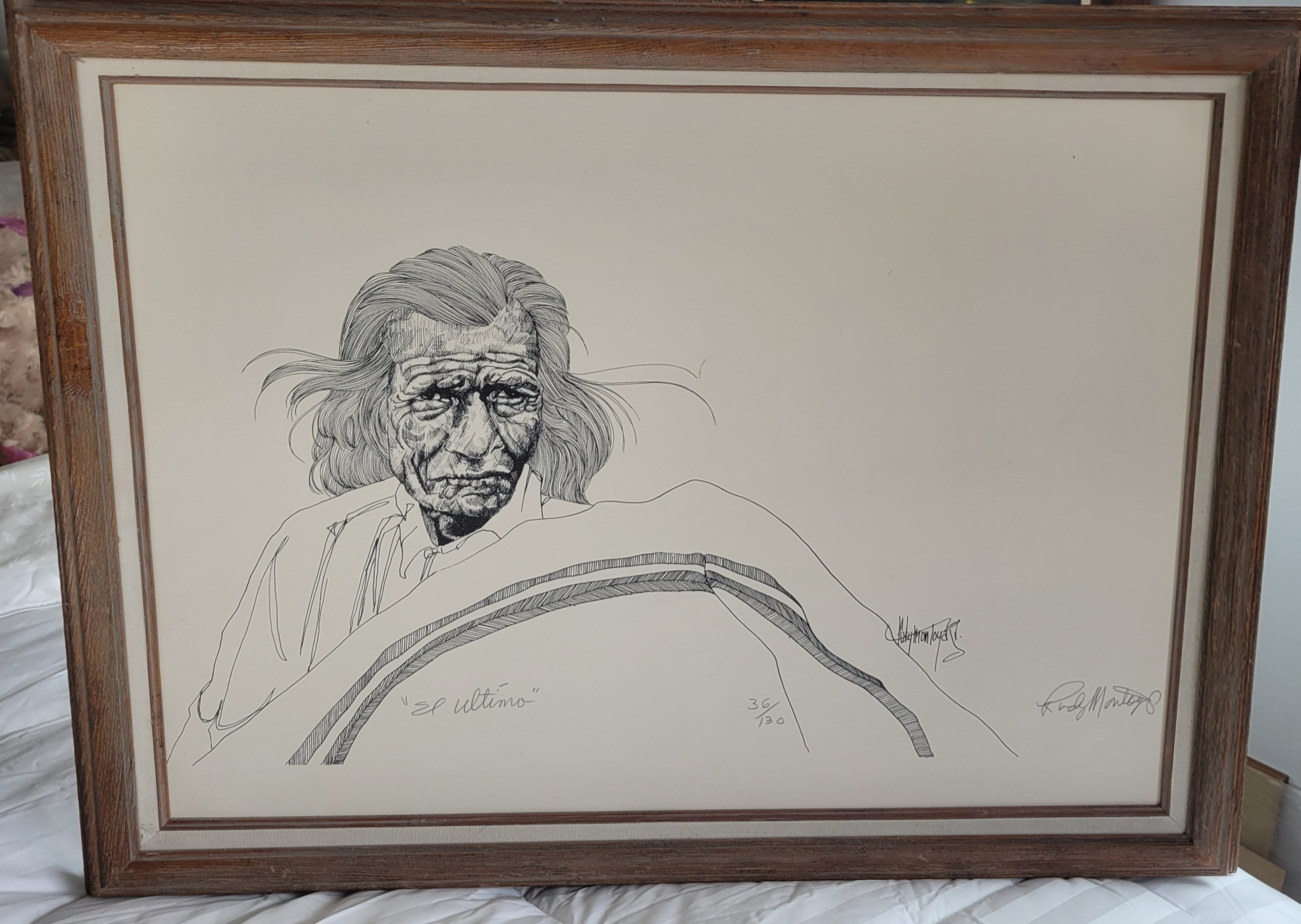 History and Background: Rudy Montoya Jr. is a recognized artist, often celebrated for his work portraying Native American themes, figures, and cultural elements. His art frequently emphasizes intricate details and emotional depth, reflecting a deep respect for his subjects. "El Ultimo," translated as "The Last," appears to depict a powerful, introspective portrait, likely tied to themes of cultural preservation and historical reflection.