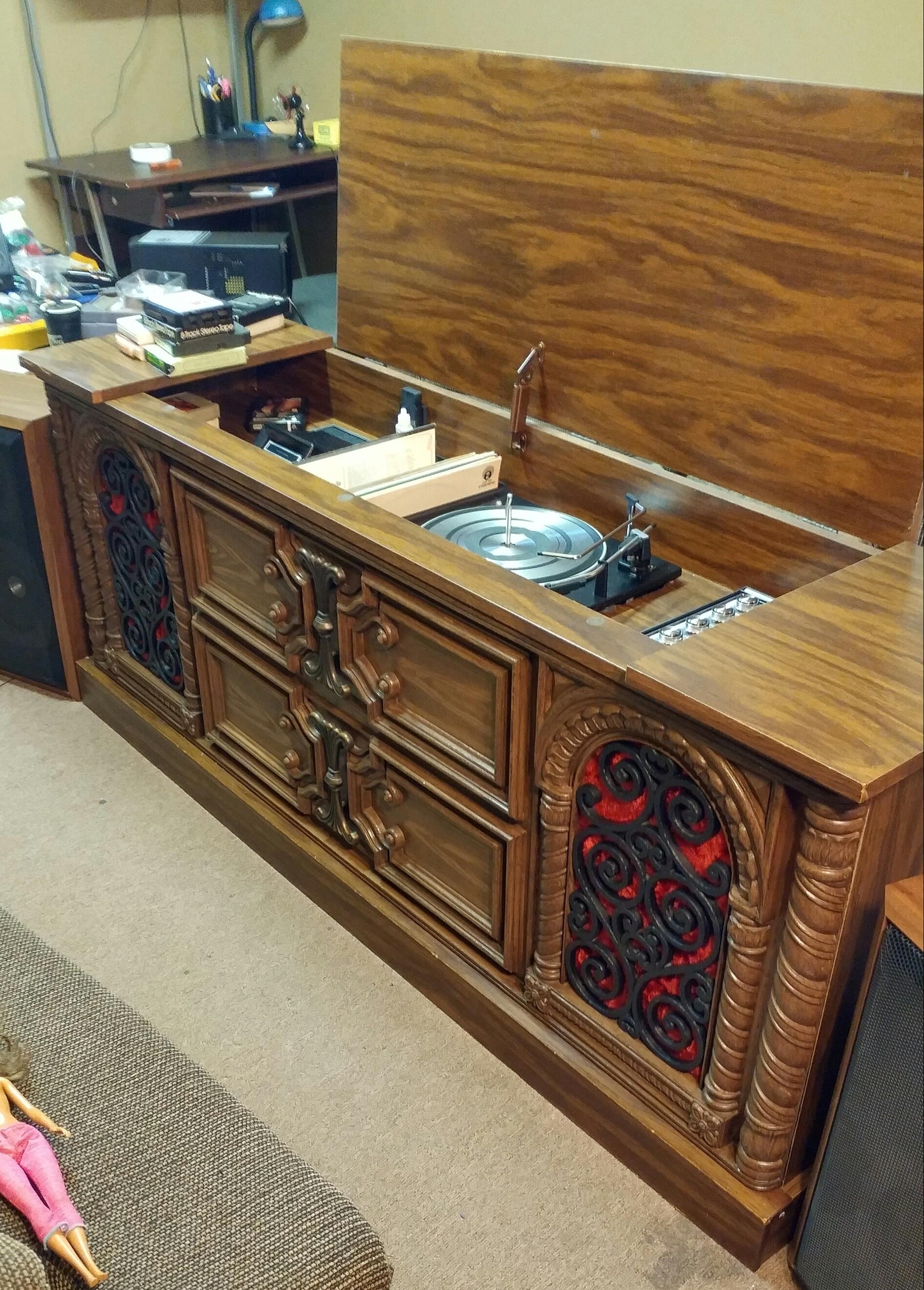 Mediterranean 67' walnut finish console with built-in 8 track tape player, am/fm stereo receiver, Garrard Professional automatic record changer with cueing control, 150 watts, FET circuitry, rocker switches for rumble, scratch, AFC, POWER ON/OFF, 12-" duo-cone", audio system featuring 2 10" woofers and four 4" high frequency tweeters. Headphone and mic/guitar jacks with additional jacks for satellite speakers. Dimensions: 67" width, 26.5" height, 18" depth. I have personally verified that all three audio components are fully functional and surprisingly it sounds very good . I was able to find this (via various archived newspaper advertisements) dating back until November 1972. Just wondering if there is any significant value to this.
