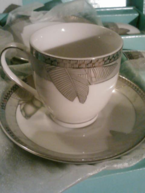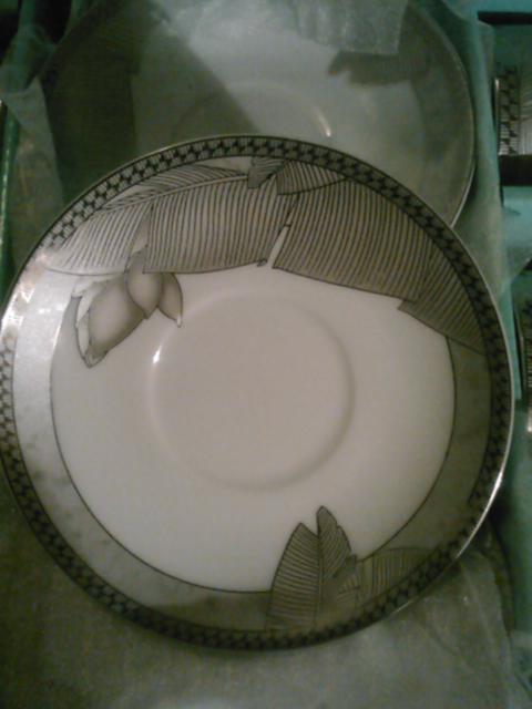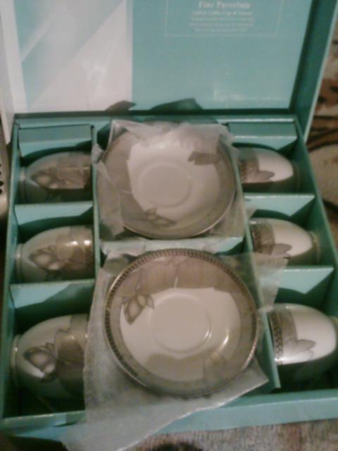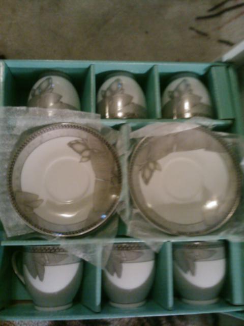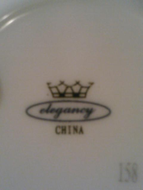 ELEGANCY Fine Porcelain 12pc Teacup & Saucer Set. Made in China. Exquisite. Mint Condition- not a ding or a scratch anywhere. In original box w/seperation papers. Inside of the box it has a printed warning that says "To keep the Gold & Colors everlasting..." Don't know if that means they are gold- white gold- gold leaf- etc... (I see a faint gold tone, but to me they look silver.)