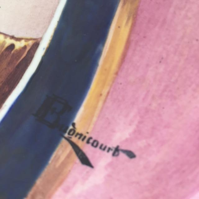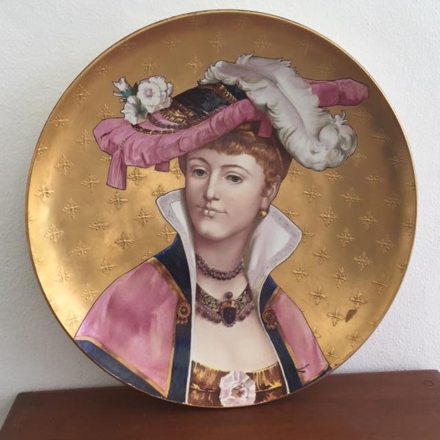 Painted porcelain plate of a fancy lady of an earlier era measuring 17.5 in. in diameter.