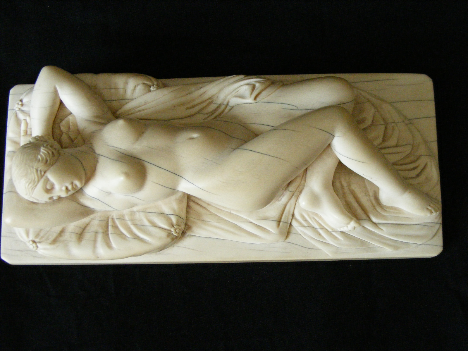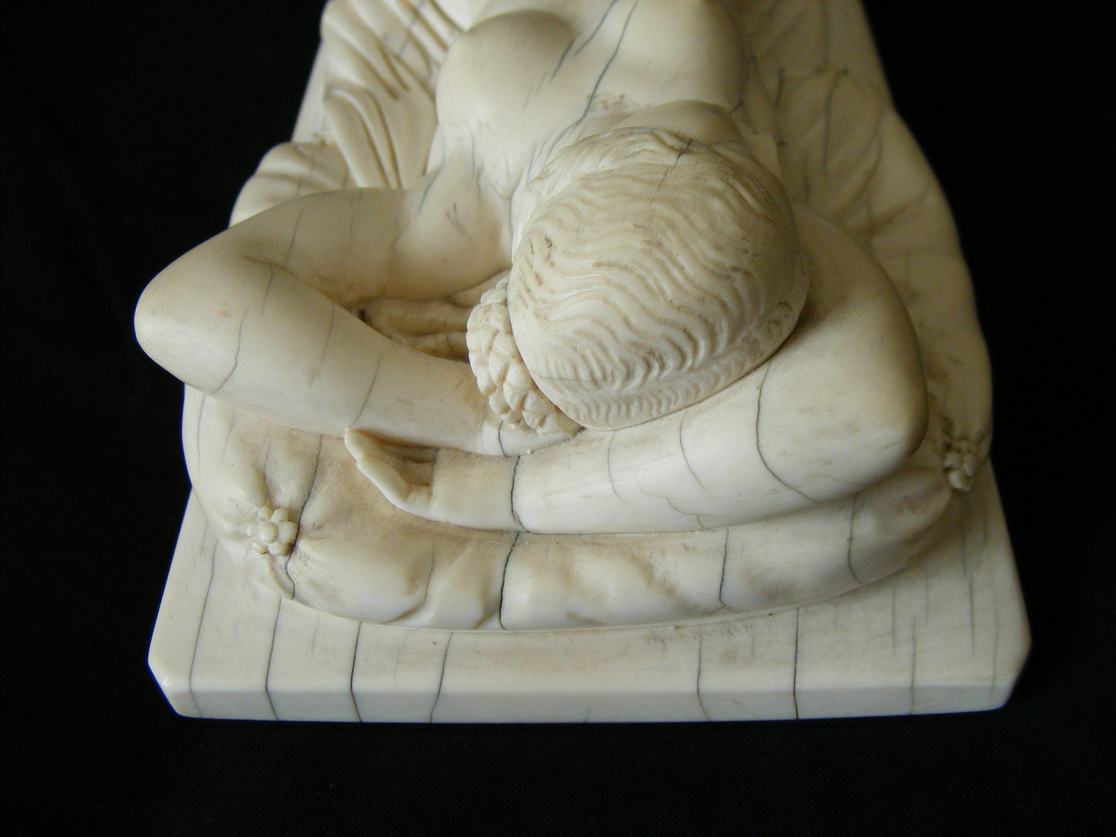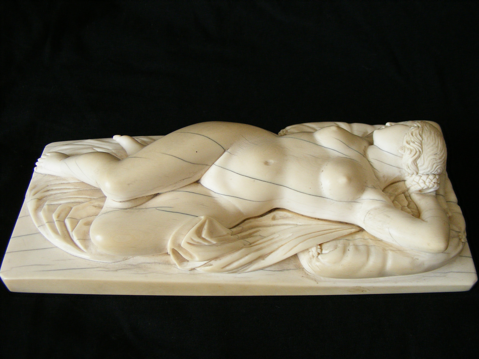 Inherited from my Godfather in NY about 1970. Elephant ivory carving of sleeping Venus after German sculptor Leonhard Kern (17th C). Piece is elephant ivory with Schreger lines. Quite a heavy piece. No discernable signature although there is a small number "15" carved on the reverse (inventory number?) and underlined (see photo). No apparent damage or reairs anywhere but there are ivory age lines. The piece is about 8-1/2" long, 3-1/2" wide and 2-1/2" high. A magnificent carving with a lot of detail. Not a doctor's doll.