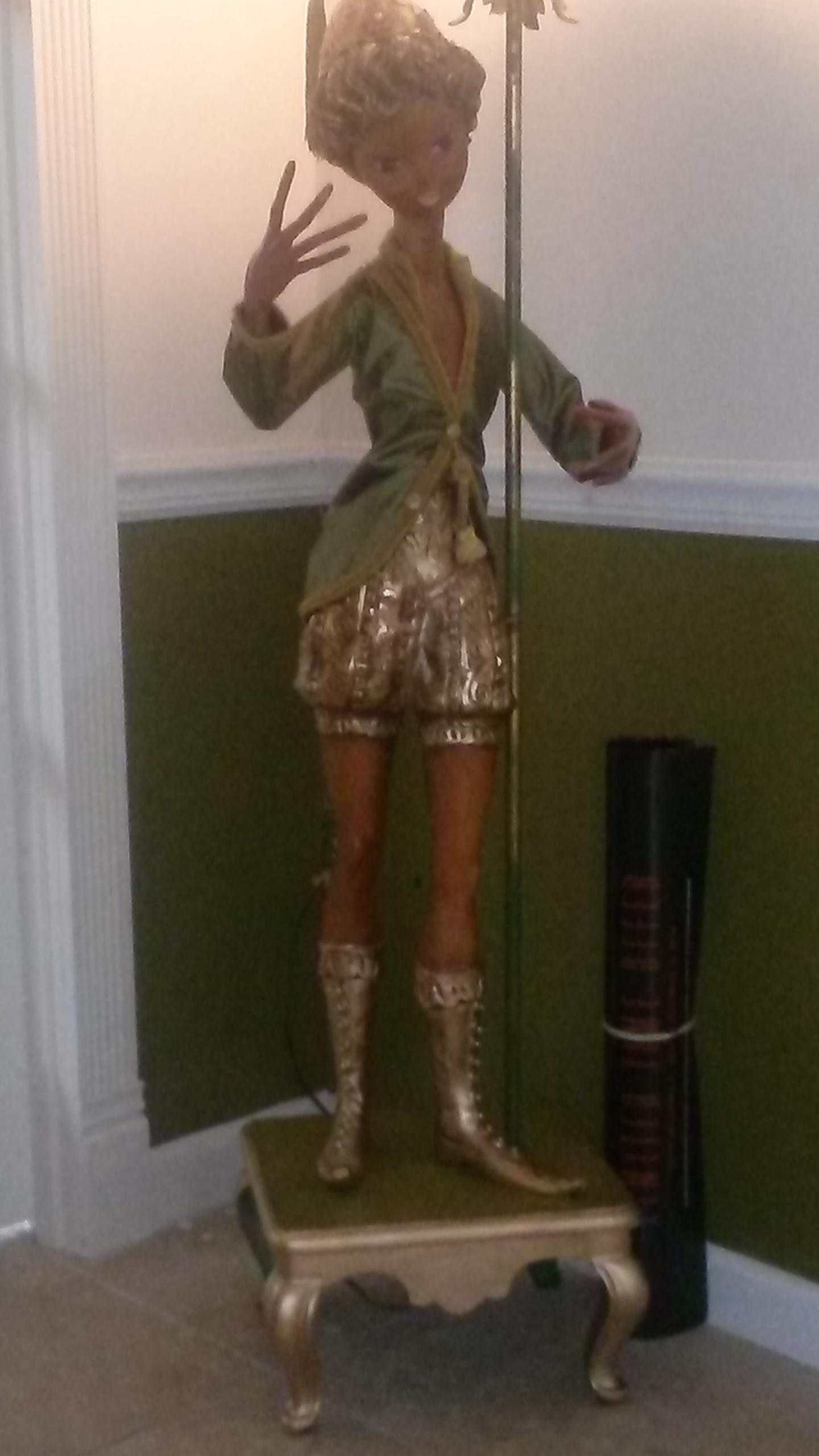 A pixie or elf standing about 4' tall arm around a long stem floor lamp mounted on a small stool. Guilded short pants and pointed hat a green and gold long sleeve jacket. The hat and jacket are adorned with white pearls.