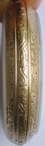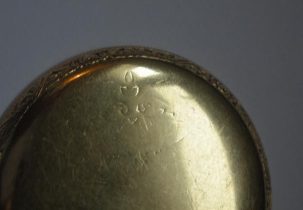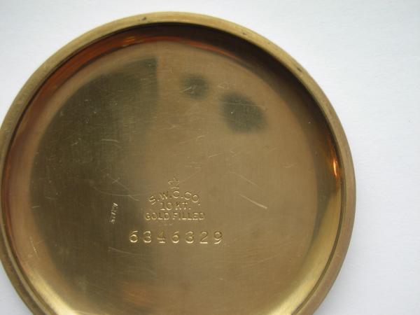 It has some light scratches but no dents and nothing wrong except needs tuning. Can set time but it is not ticking. When entered serial number, 387 is grouping? The back is a screw on and is double plated. The sides have beautiful etching and on the back bottom there is a fluer de Lis or a bird... I attached detailed pictures. The inside looks brand new. There is numbers and logos all in pics. On back plate:a star, s.w.c.co.,10k gold filled, 6346329, 2 sets of #'s or name but can't make out, looks like hand written/etched. Serial # 24040969.