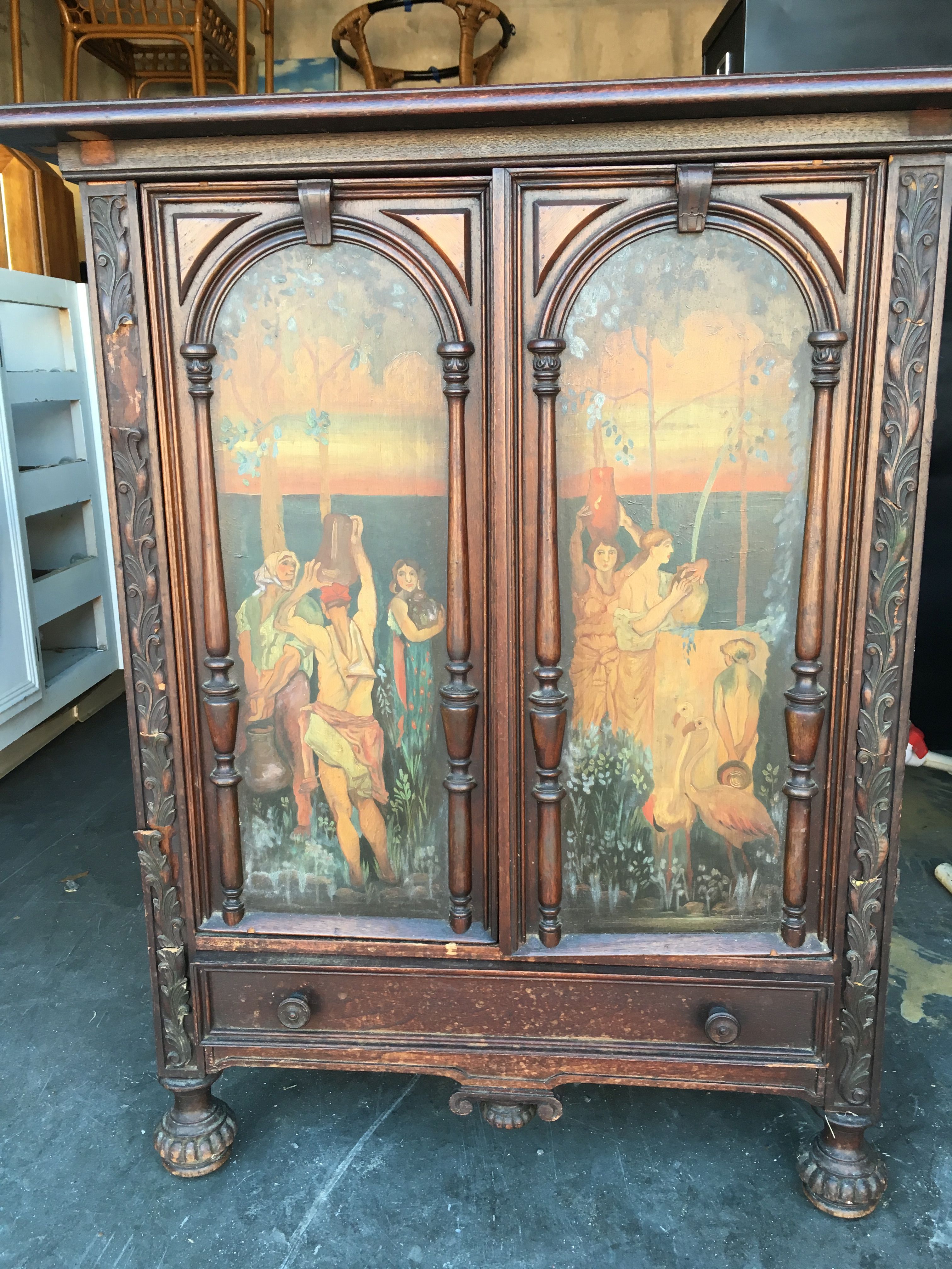 I have a cabinet made by Elgin A. Simonds Company. It has painted murals on each of the doors, and a drawer below. It measures 35" high x 28.5 wide at top x 17.5 deep. I'm sure its value is diminished by the damaged scrolling trim and that someone drilled a hole in the back to use it as a TV stand.