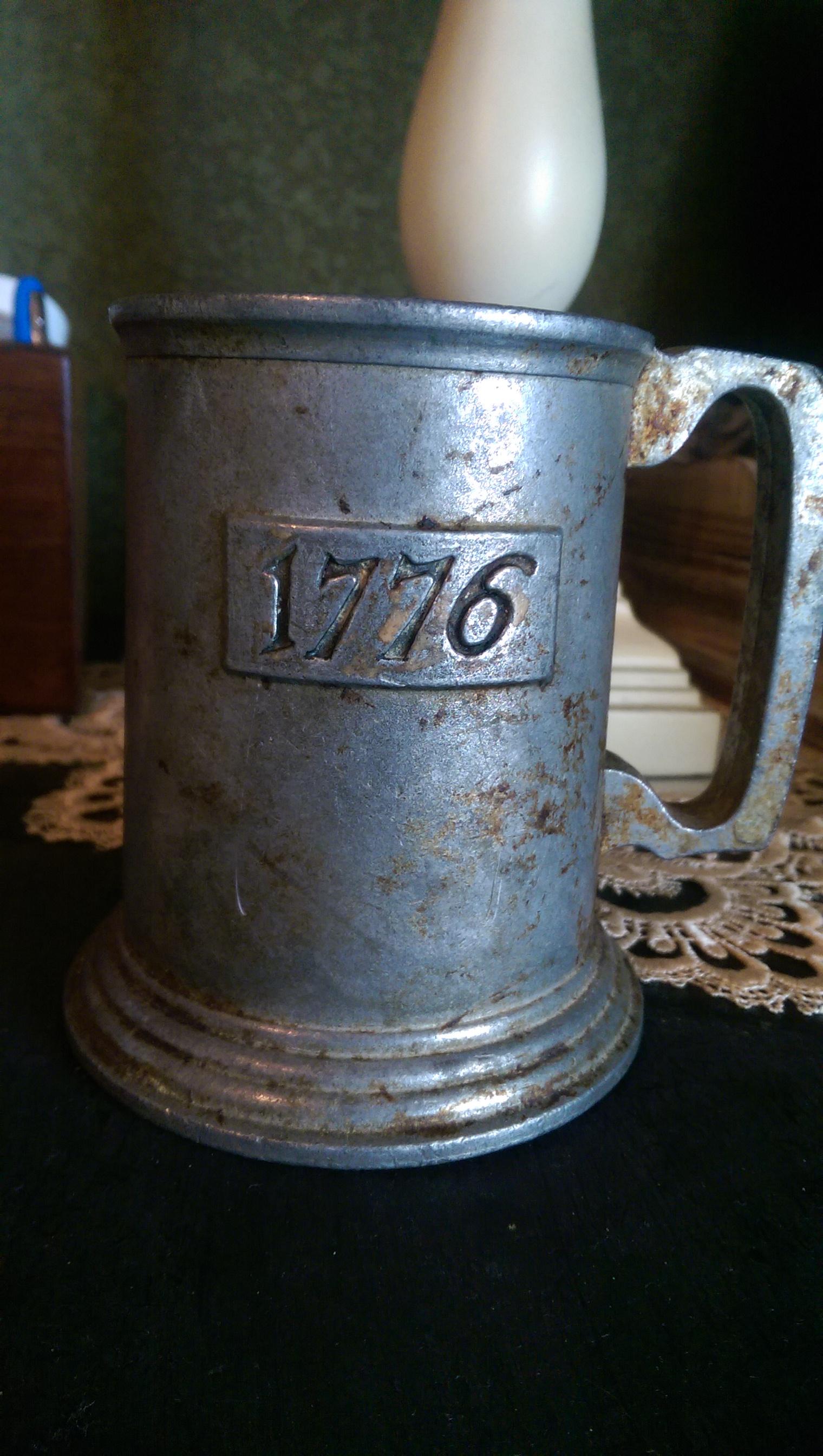 have an old mug like container. Kind of tarnished. It is sorta heavy has a raised up emblem on the front that has the number 1776.
