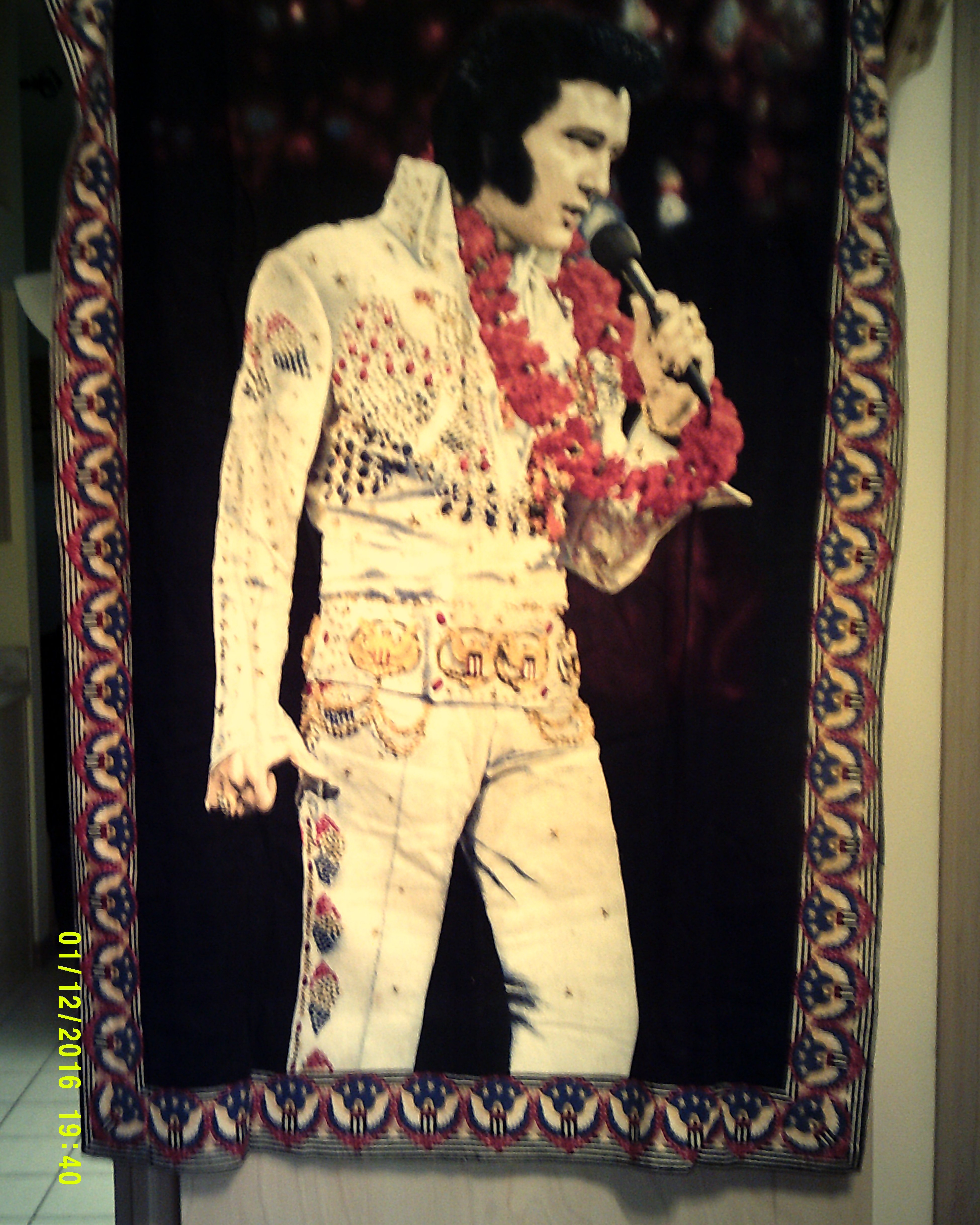 My late husband was an Elvis fanatic, and this is one of his Elvis collections that he kept for many years. However, I'm not sure how old it is exactly or what it's worth is, but it is in excellent condition. It measures : 56"x38"