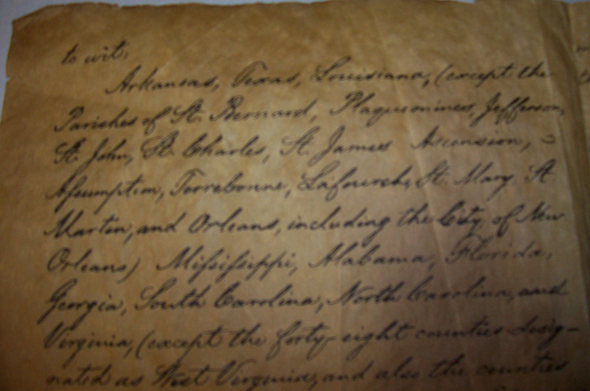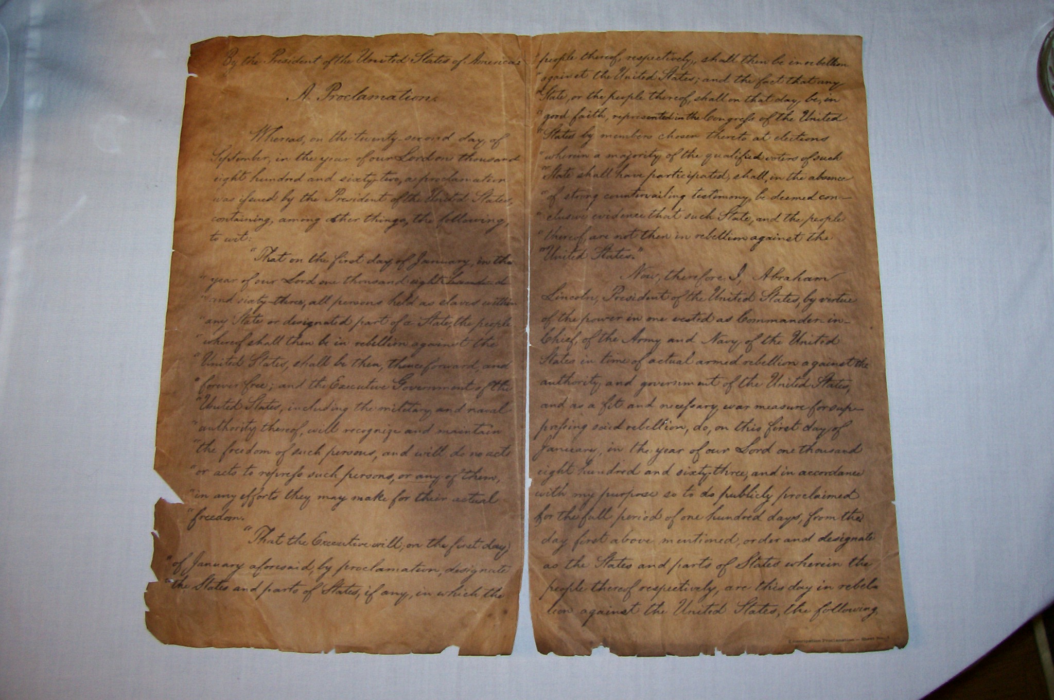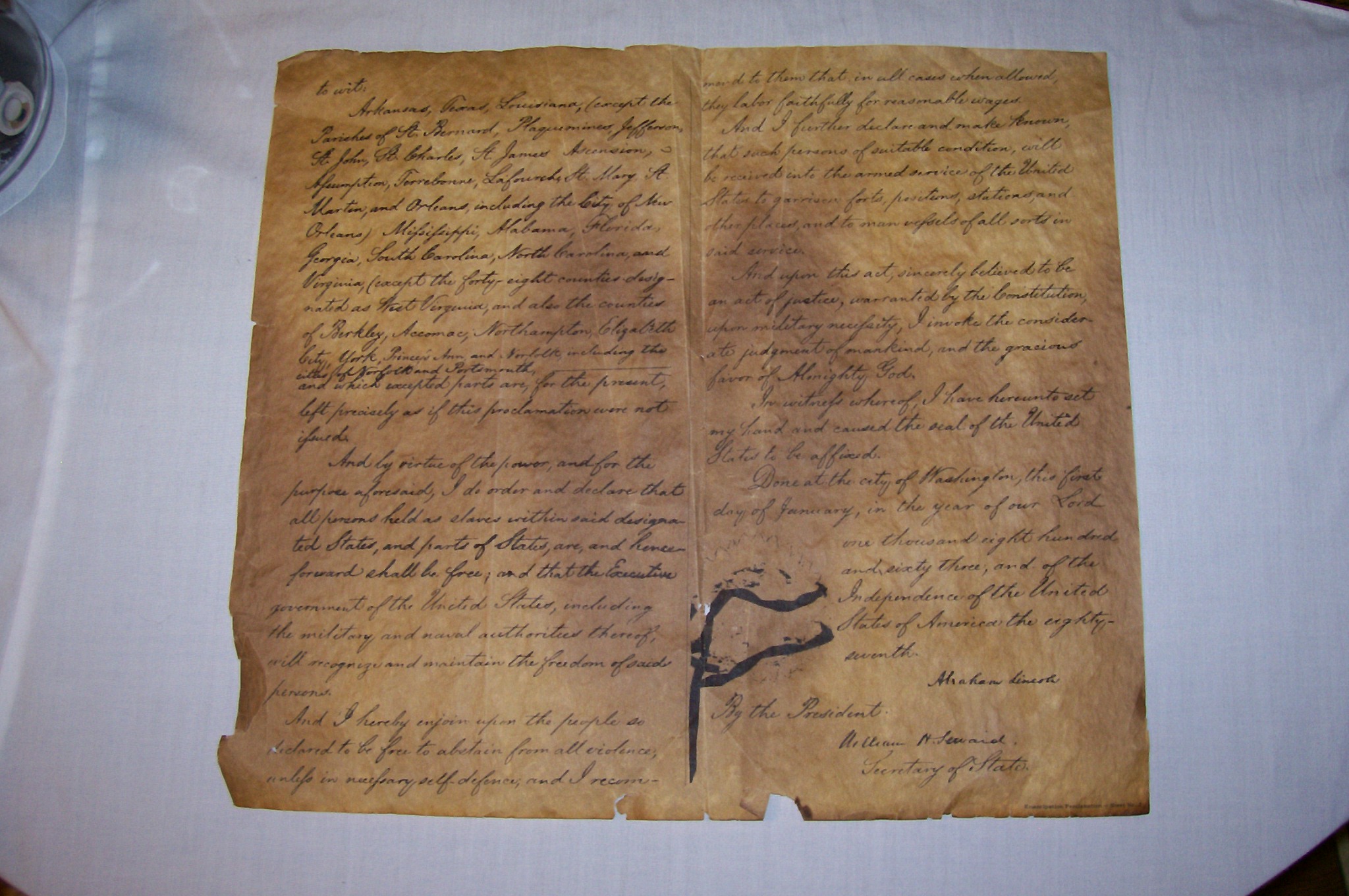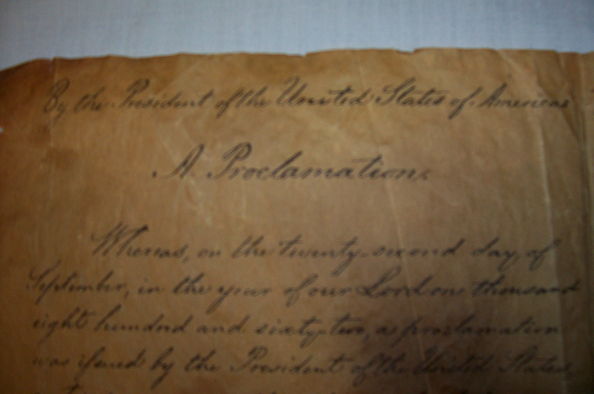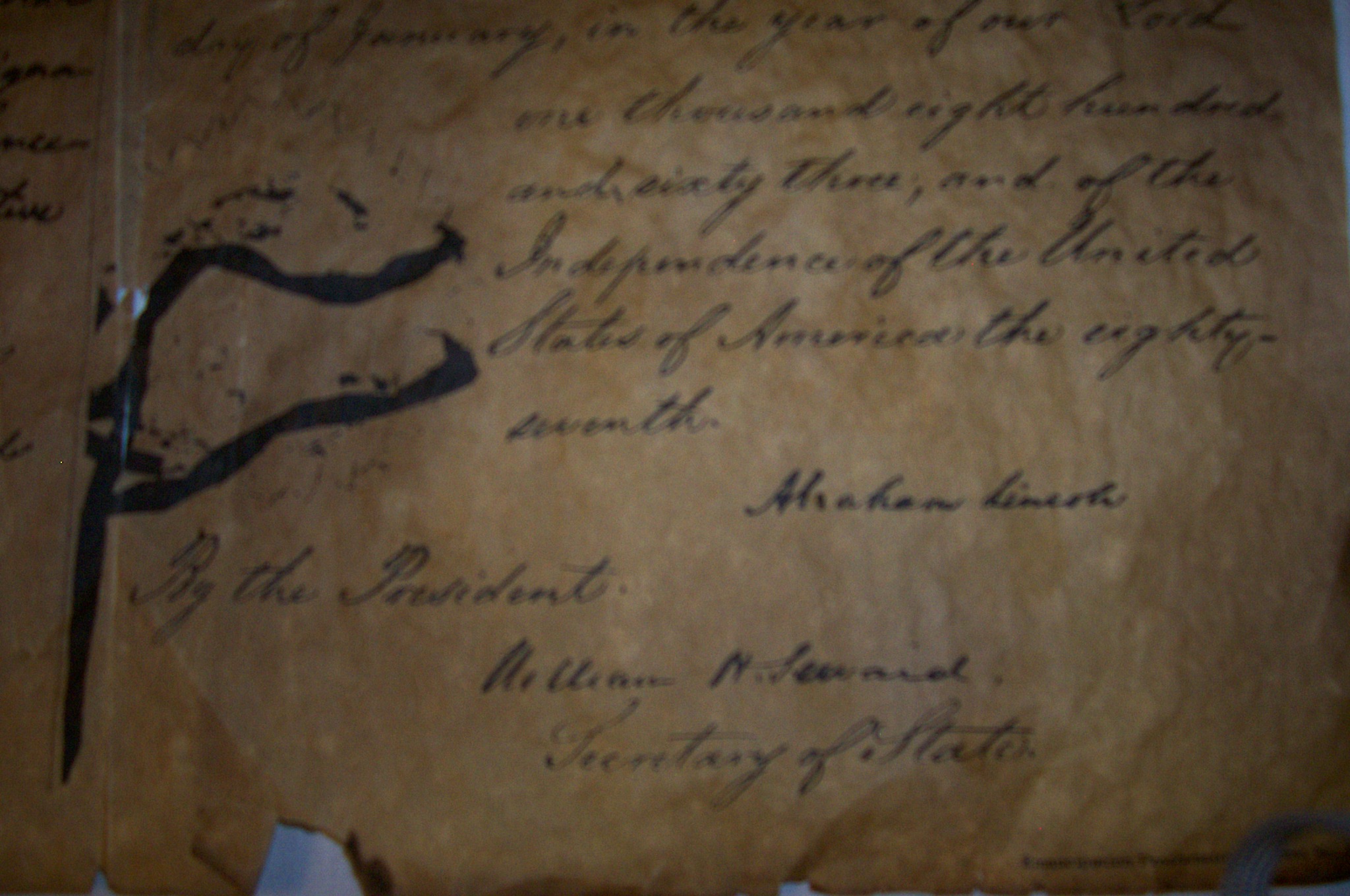 this is an old piece of paper, looks like it was hand written, with a feather pen, it is the emancipation proclamation, signed by Abraham Lincoln and William Howard